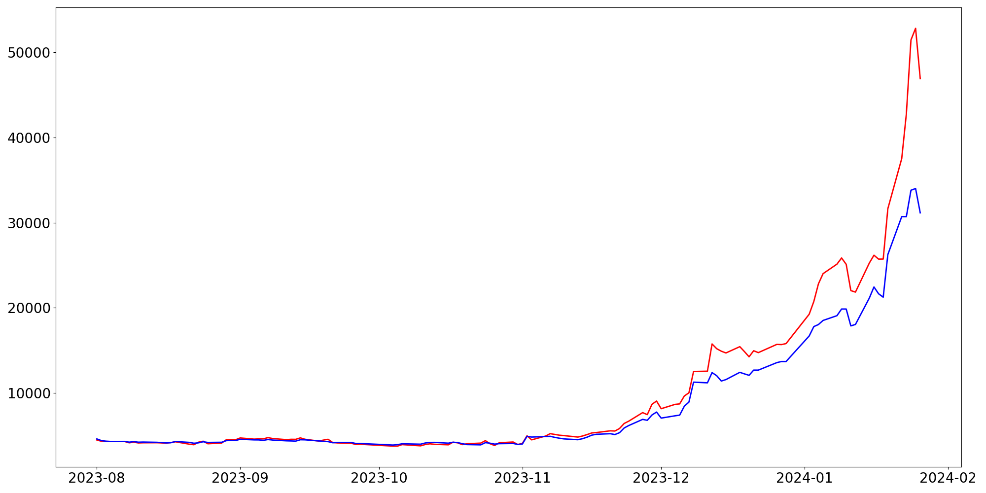 [ - : 실제값(종가) / - : 예측값(종가) ]