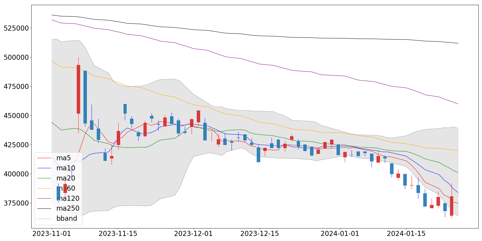 □ 중기 : 현재 종가가 중기(60일) 이동평균값(420,233원)을 하회 하여 중기적 추세 하락 중