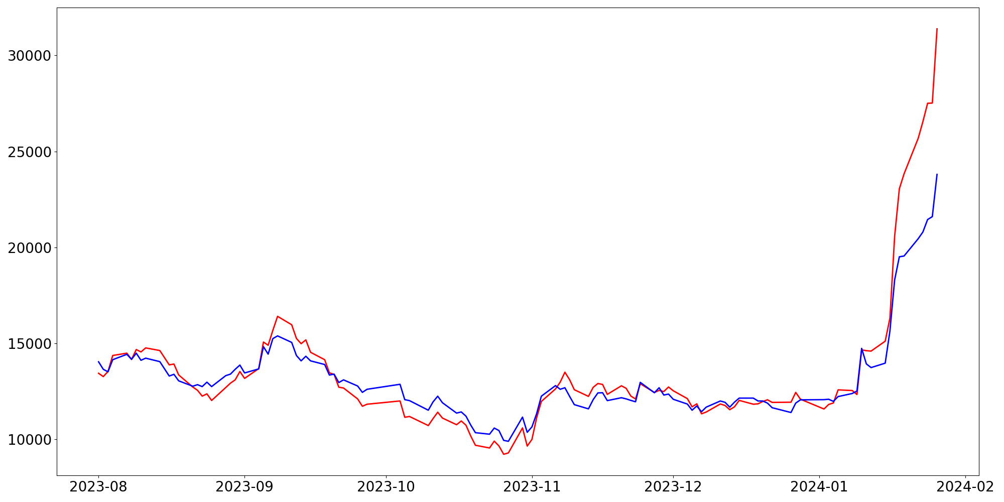 [ - : 실제값(종가) / - : 예측값(종가) ]