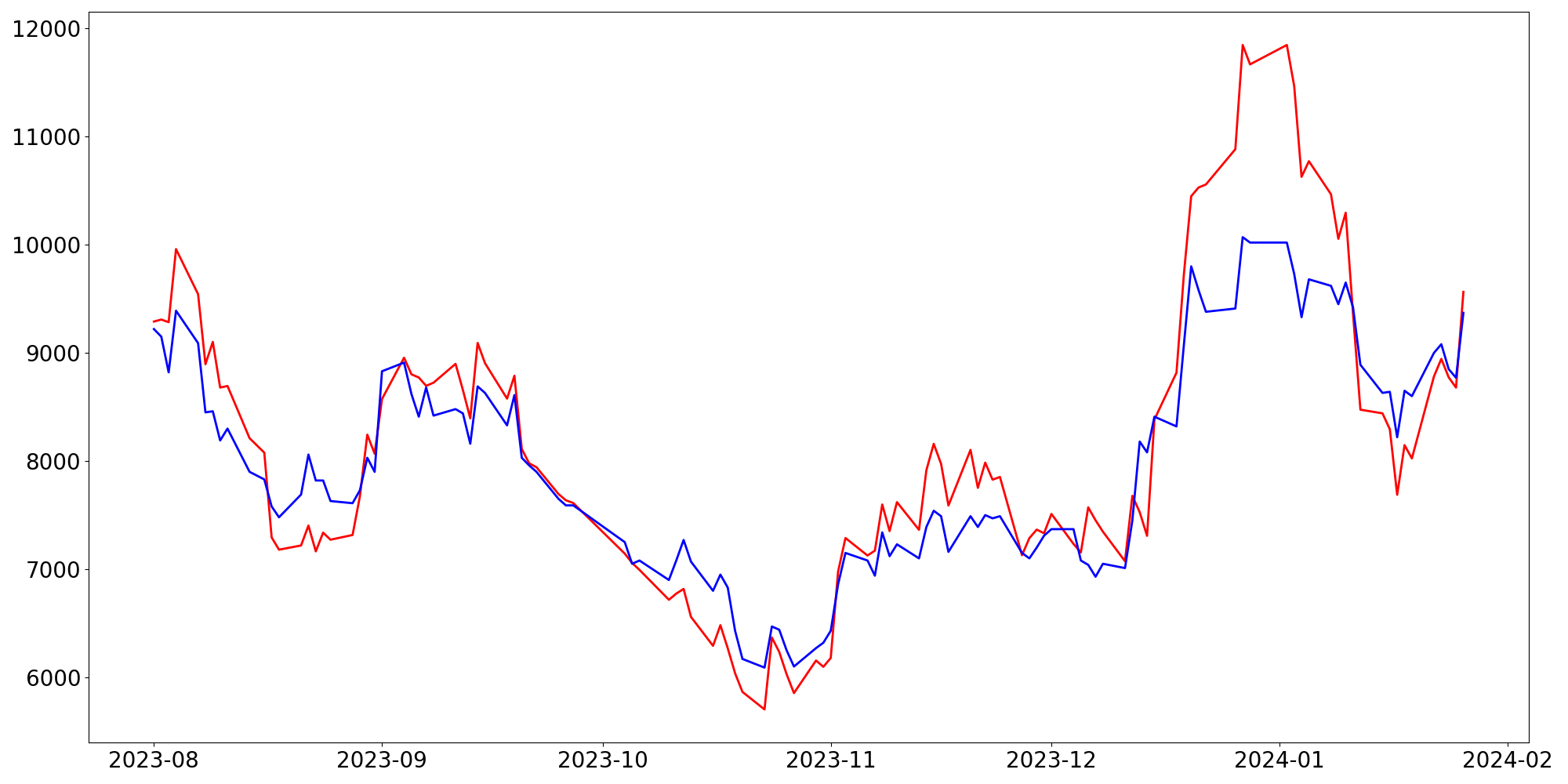 [ - : 실제값(종가) / - : 예측값(종가) ]
