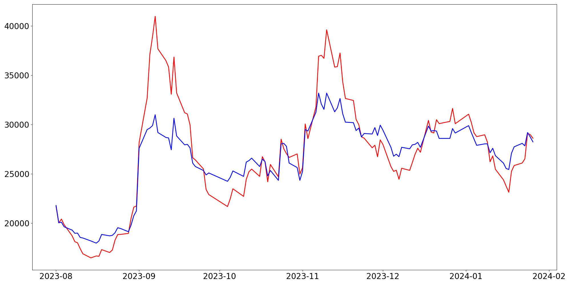 [ - : 실제값(종가) / - : 예측값(종가) ]