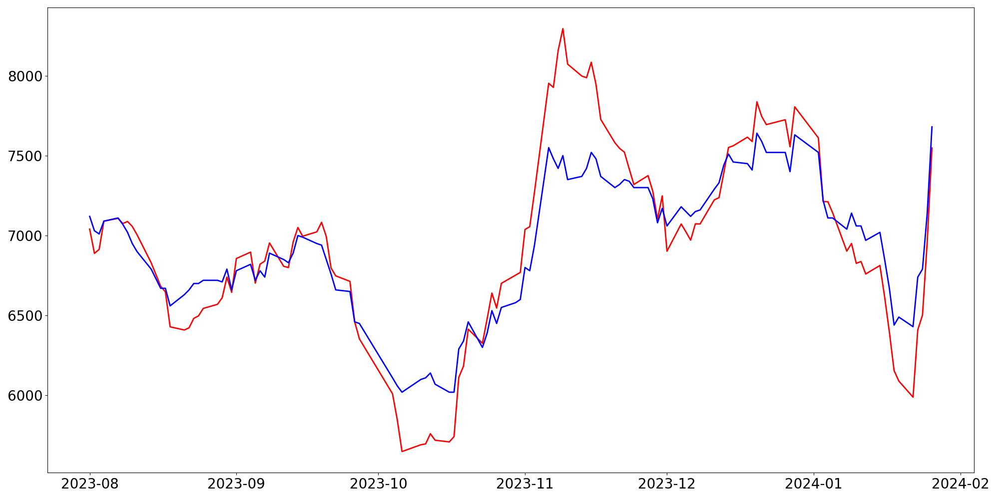 [ - : 실제값(종가) / - : 예측값(종가) ]