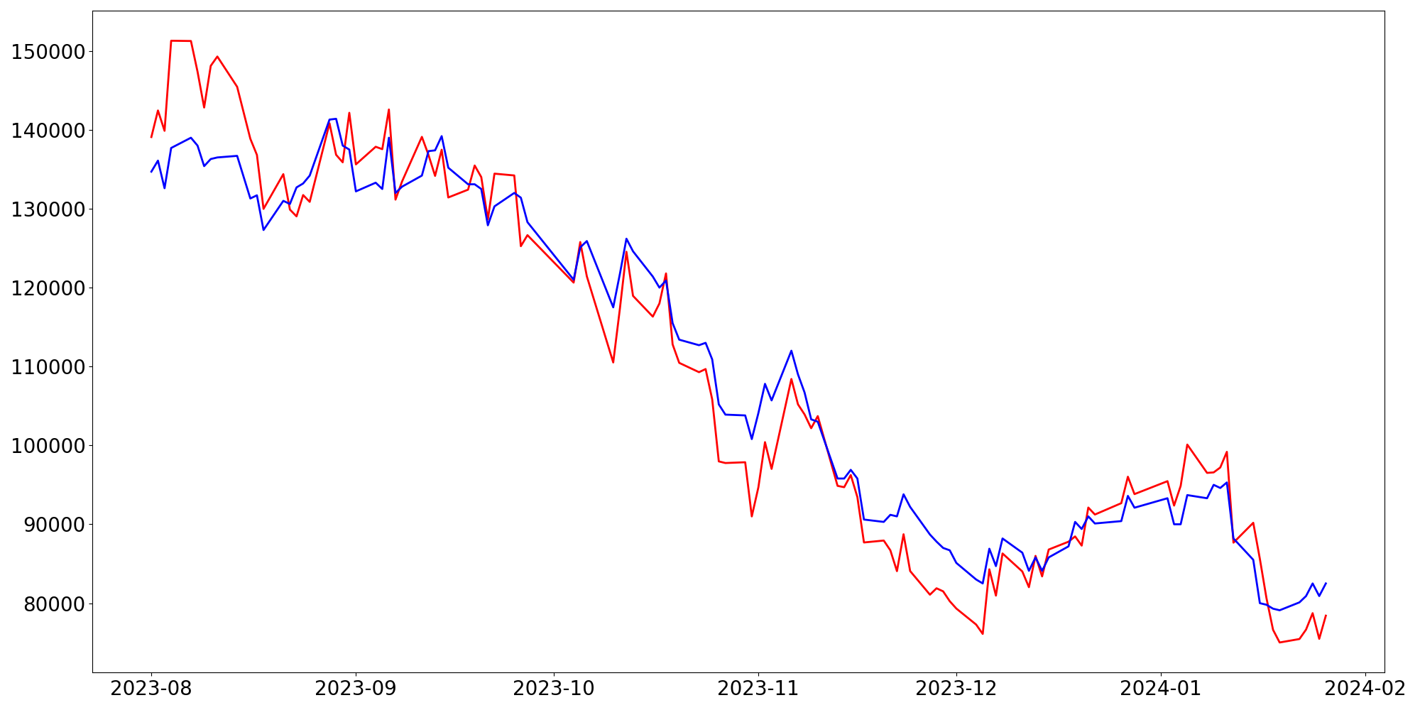 [ - : 실제값(종가) / - : 예측값(종가) ]