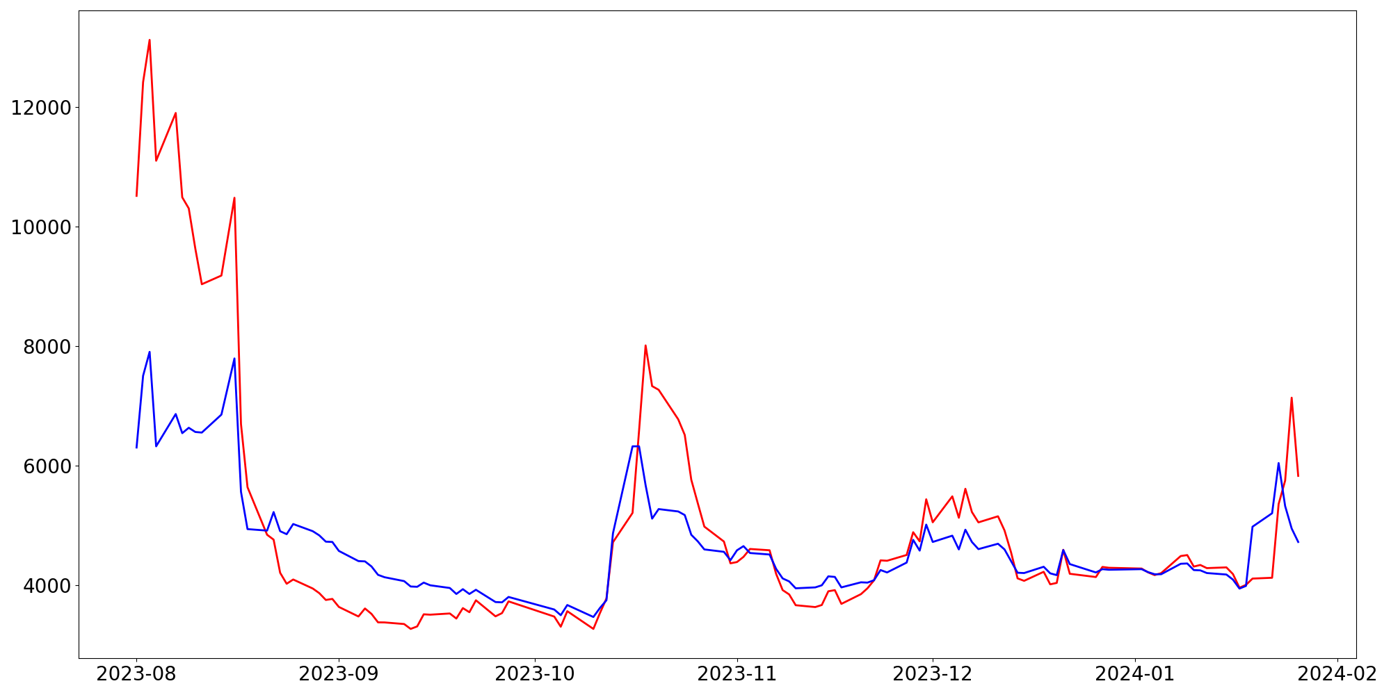 [ - : 실제값(종가) / - : 예측값(종가) ]