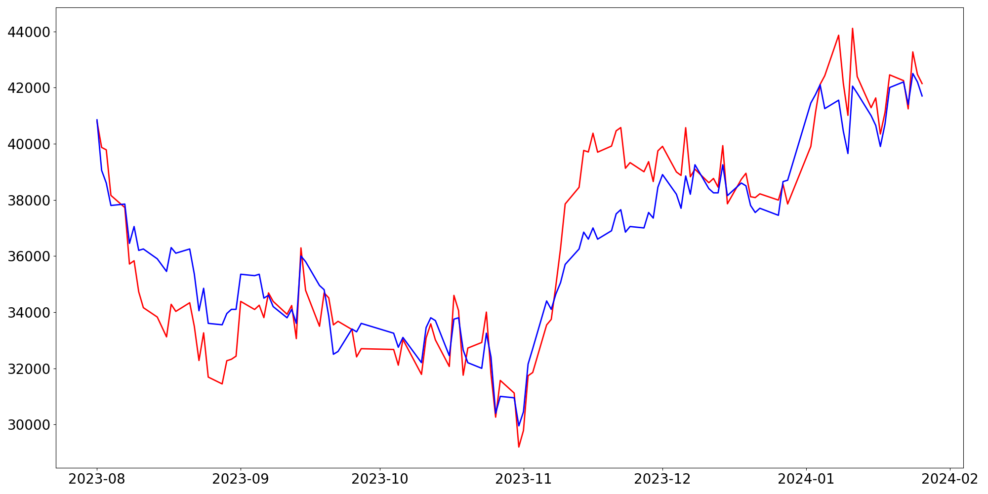 [ - : 실제값(종가) / - : 예측값(종가) ]