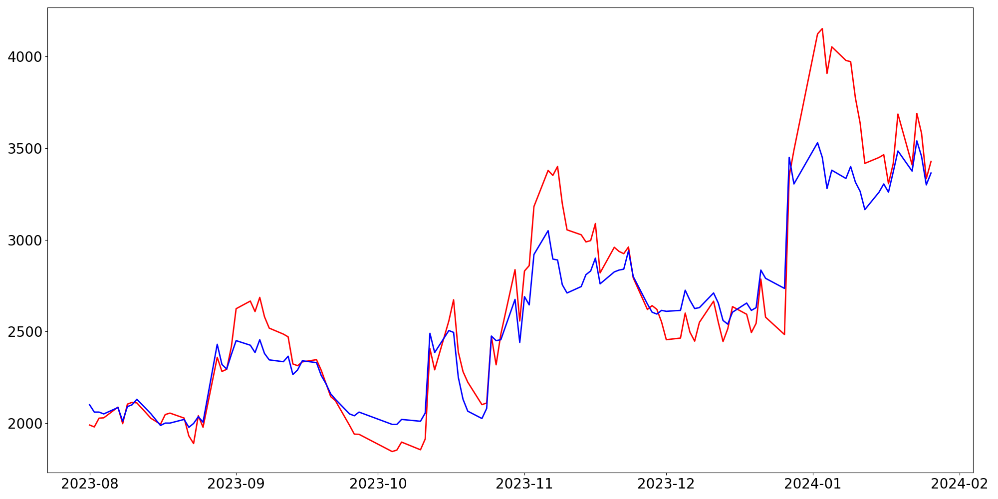 [ - : 실제값(종가) / - : 예측값(종가) ]