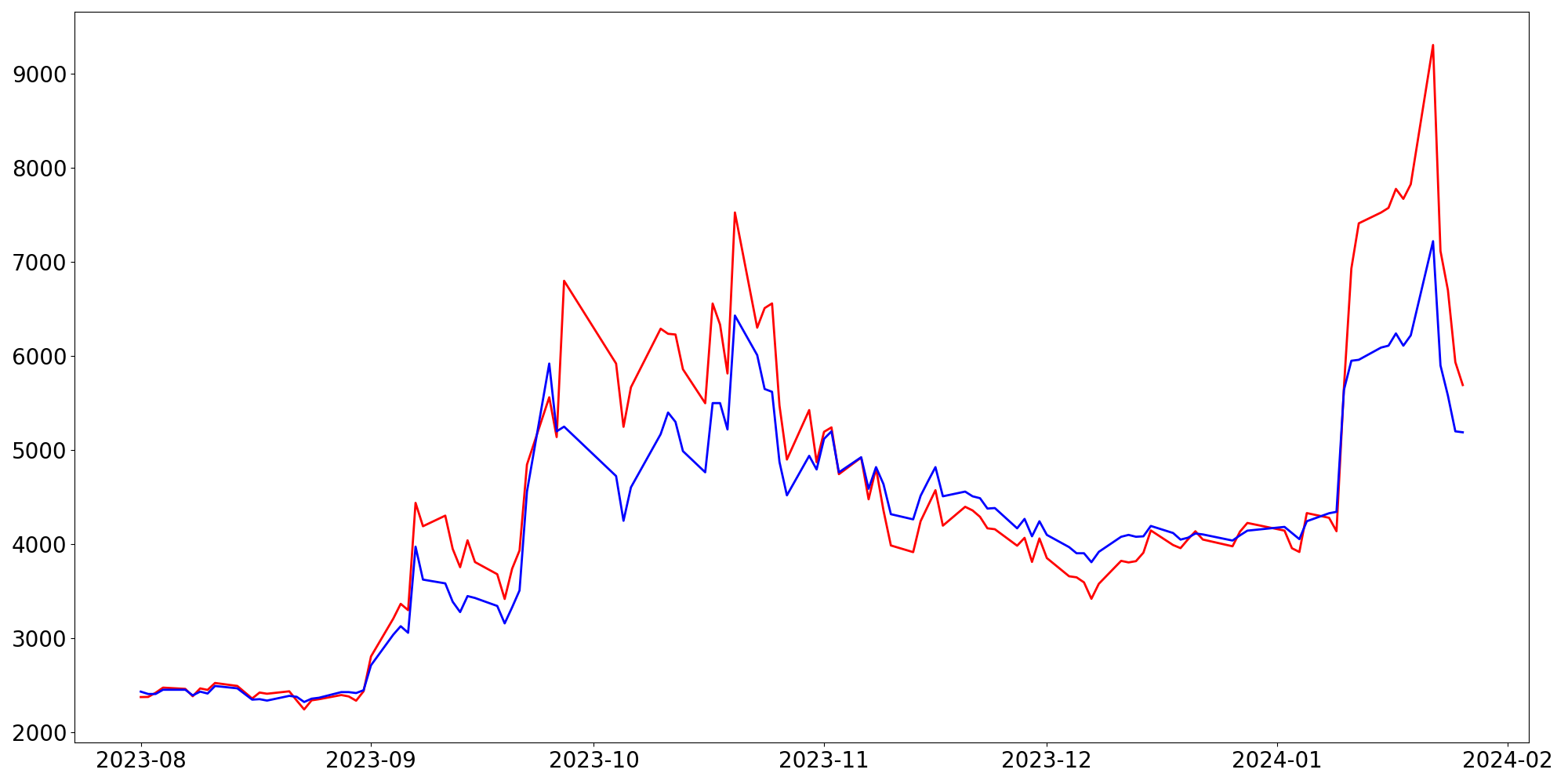 [ - : 실제값(종가) / - : 예측값(종가) ]