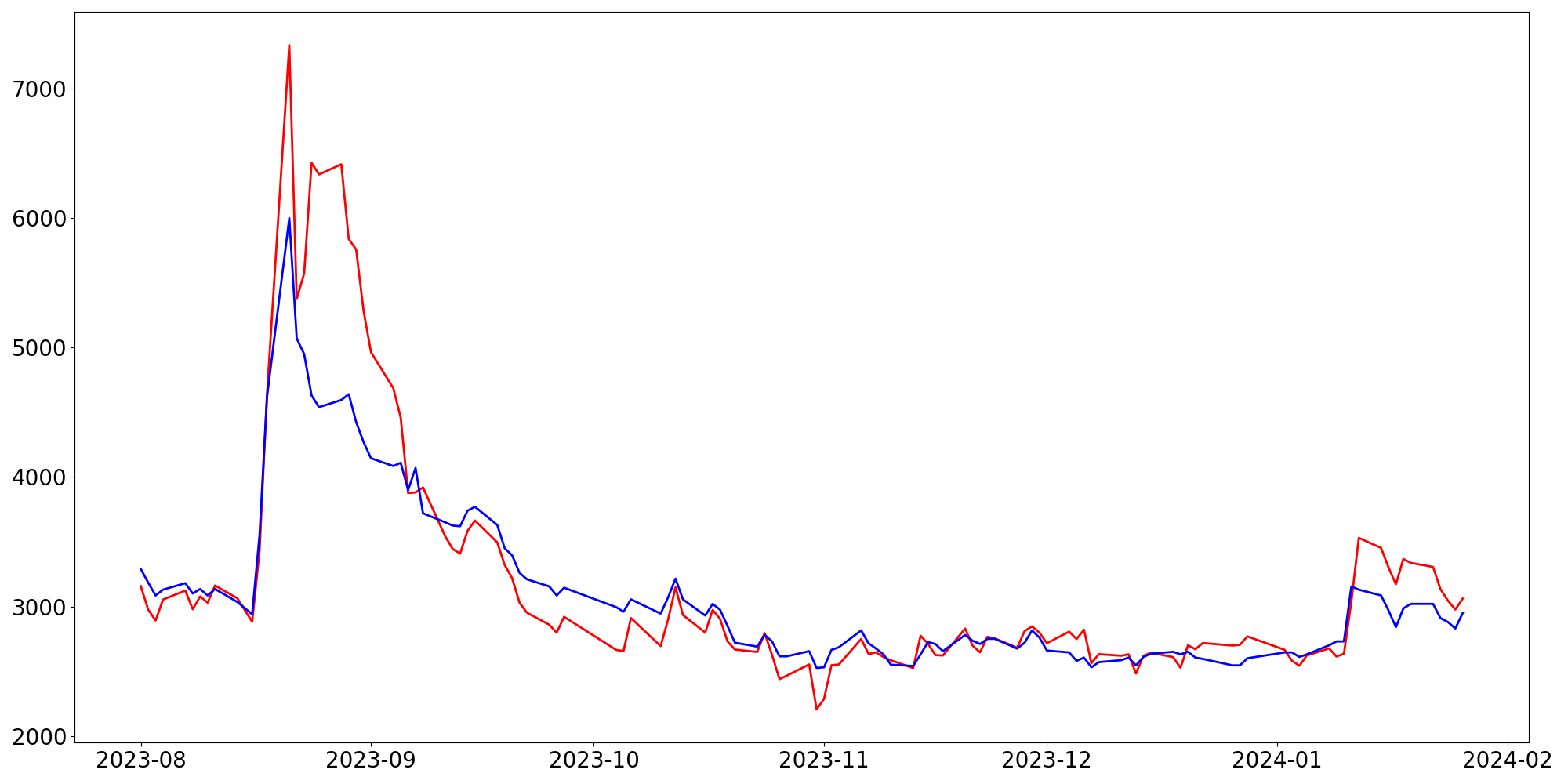 [ - : 실제값(종가) / - : 예측값(종가) ]
