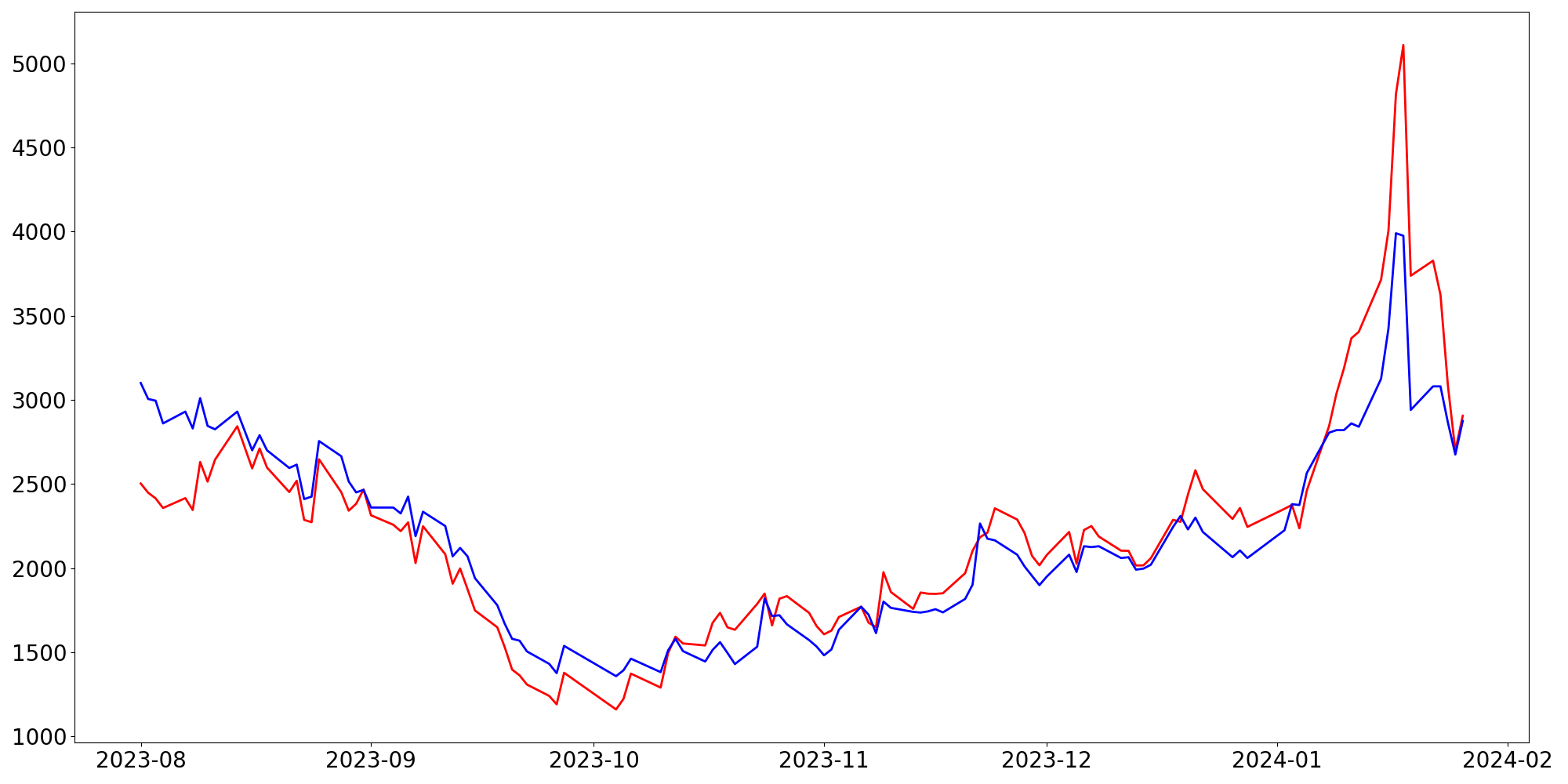 [ - : 실제값(종가) / - : 예측값(종가) ]