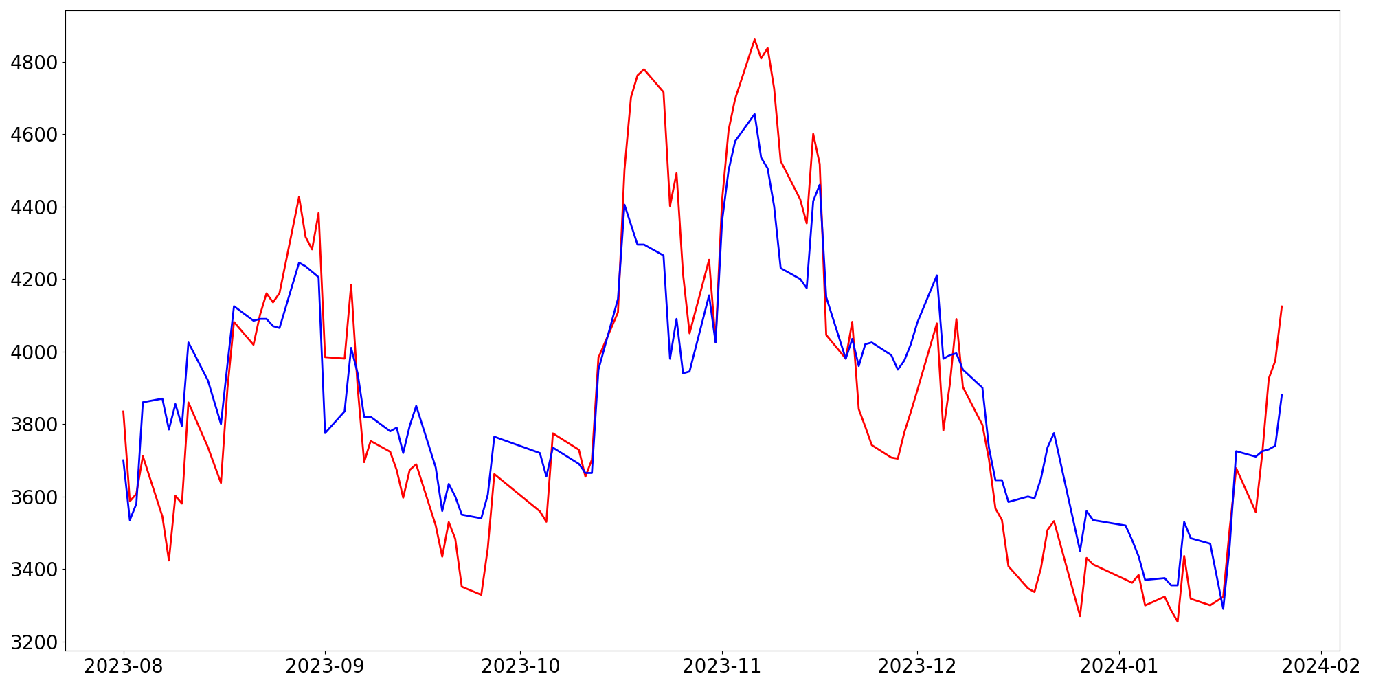 [ - : 실제값(종가) / - : 예측값(종가) ]