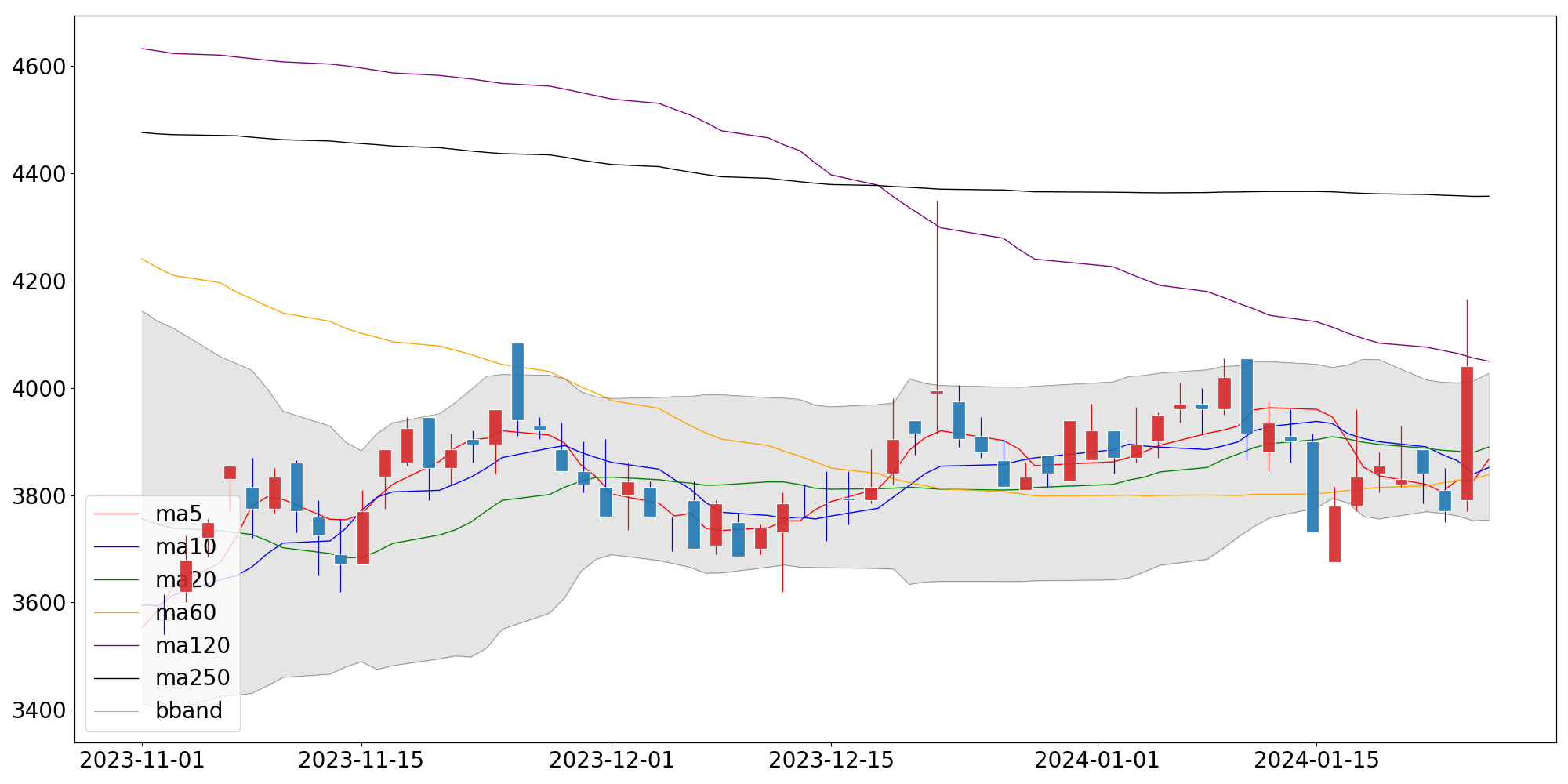 □ 중기 : 현재 종가가 중기(60일) 이동평균값(3,838원)을 상회 하여 중기적 추세 상승 중