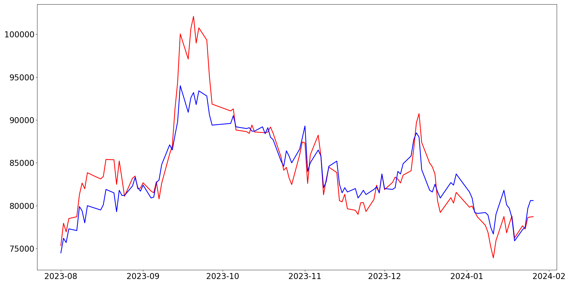 [ - : 실제값(종가) / - : 예측값(종가) ]