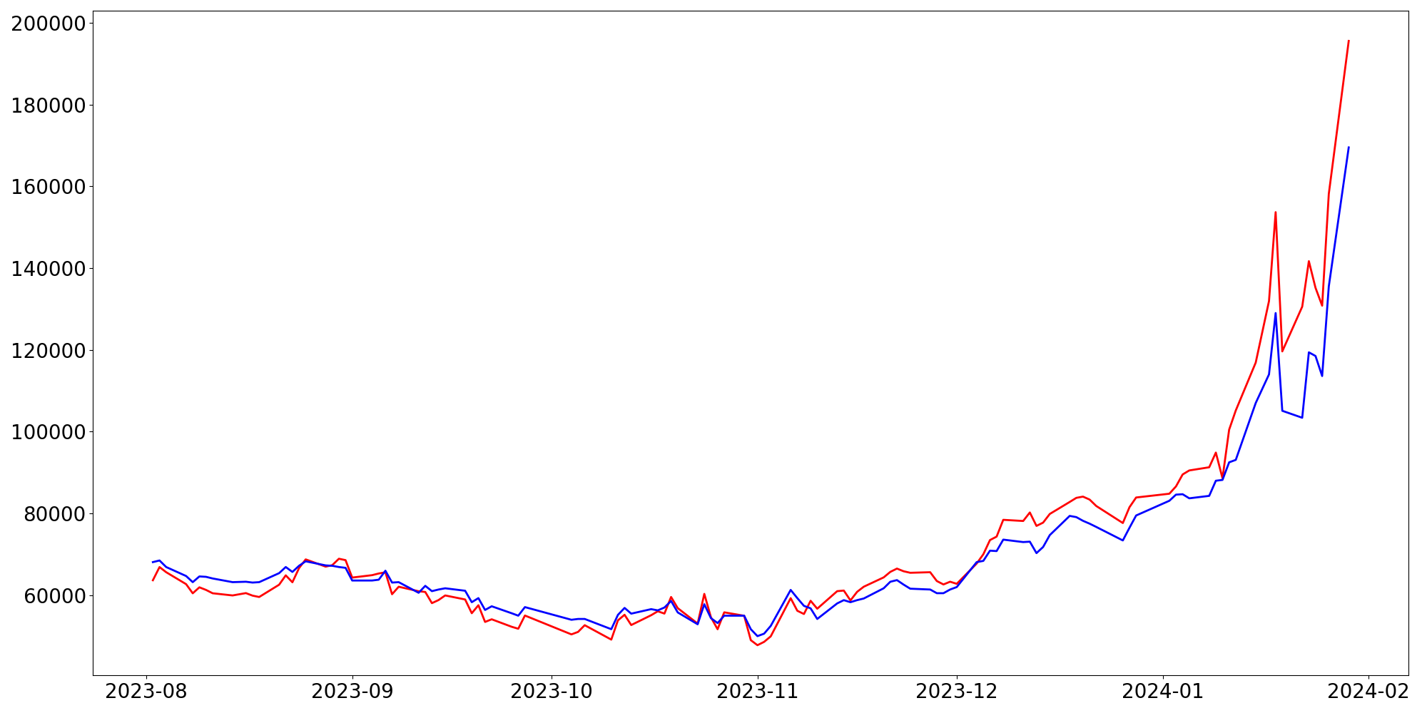 [ - : 실제값(종가) / - : 예측값(종가) ]