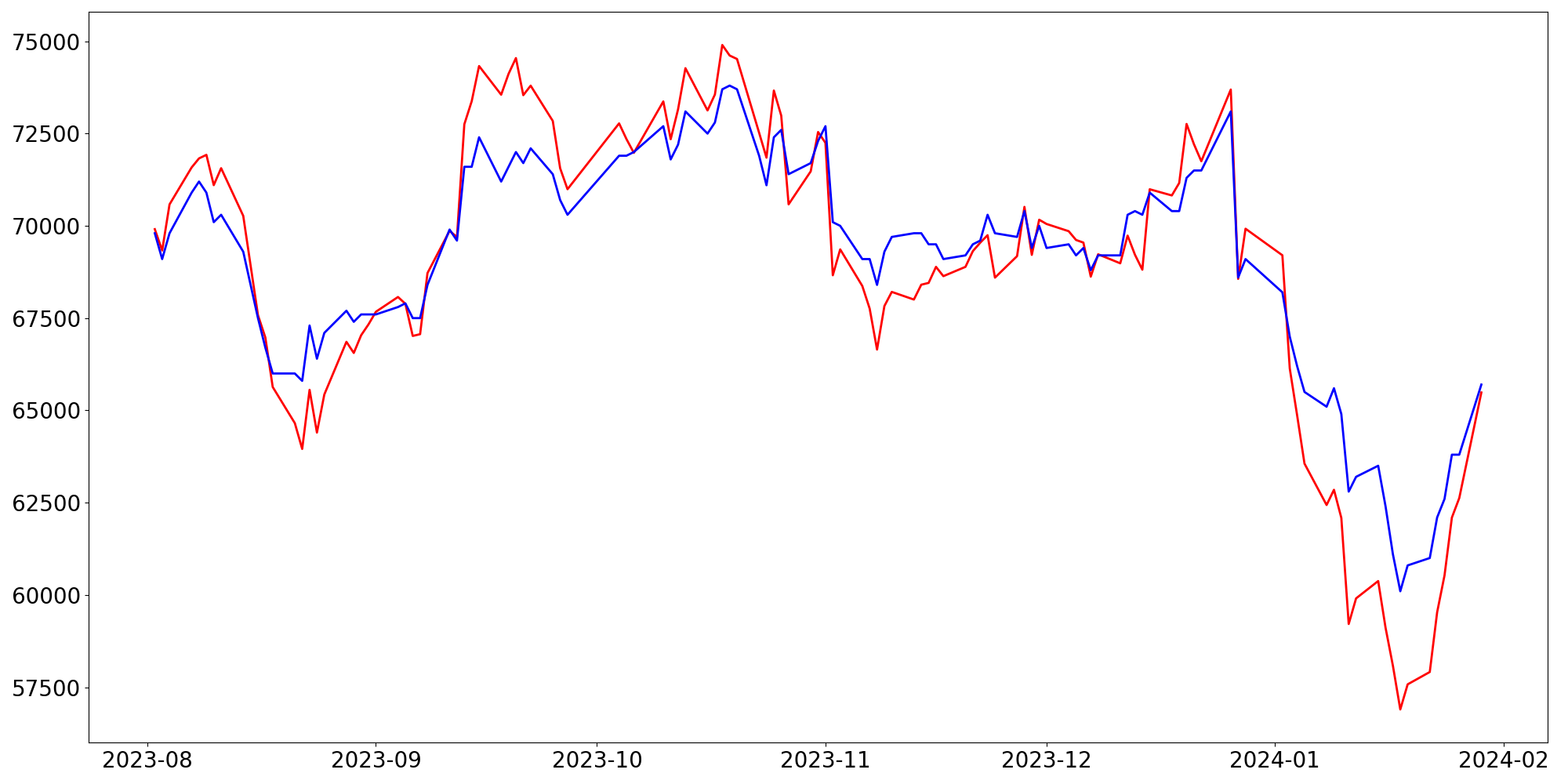 [ - : 실제값(종가) / - : 예측값(종가) ]