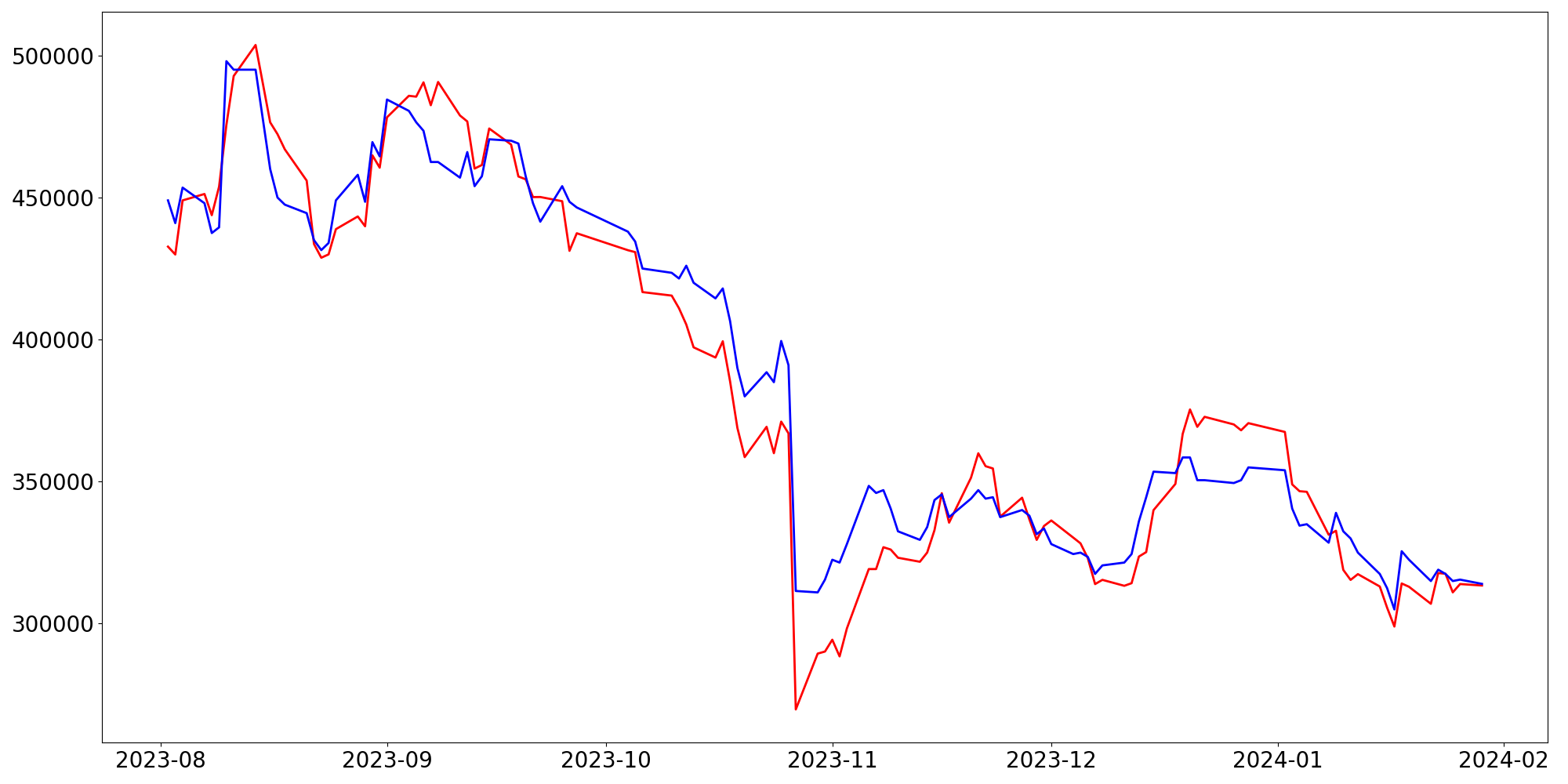 [ - : 실제값(종가) / - : 예측값(종가) ]