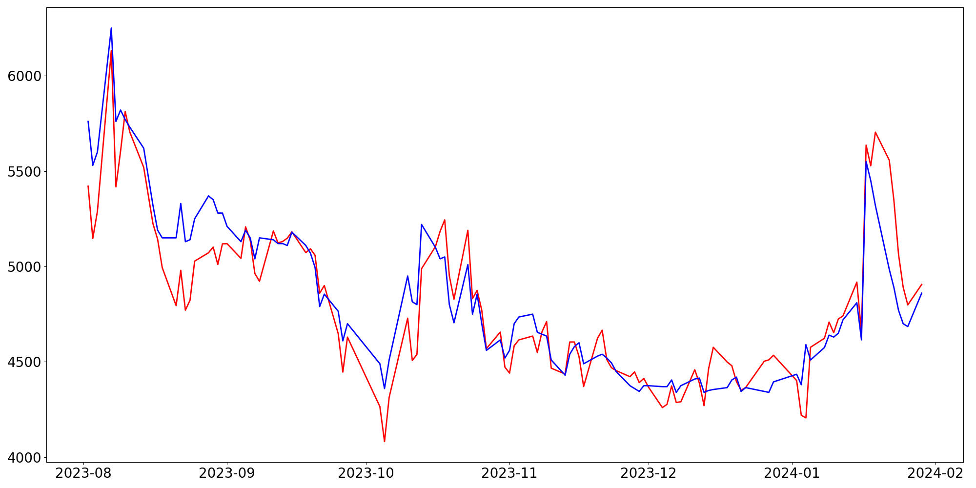 [ - : 실제값(종가) / - : 예측값(종가) ]