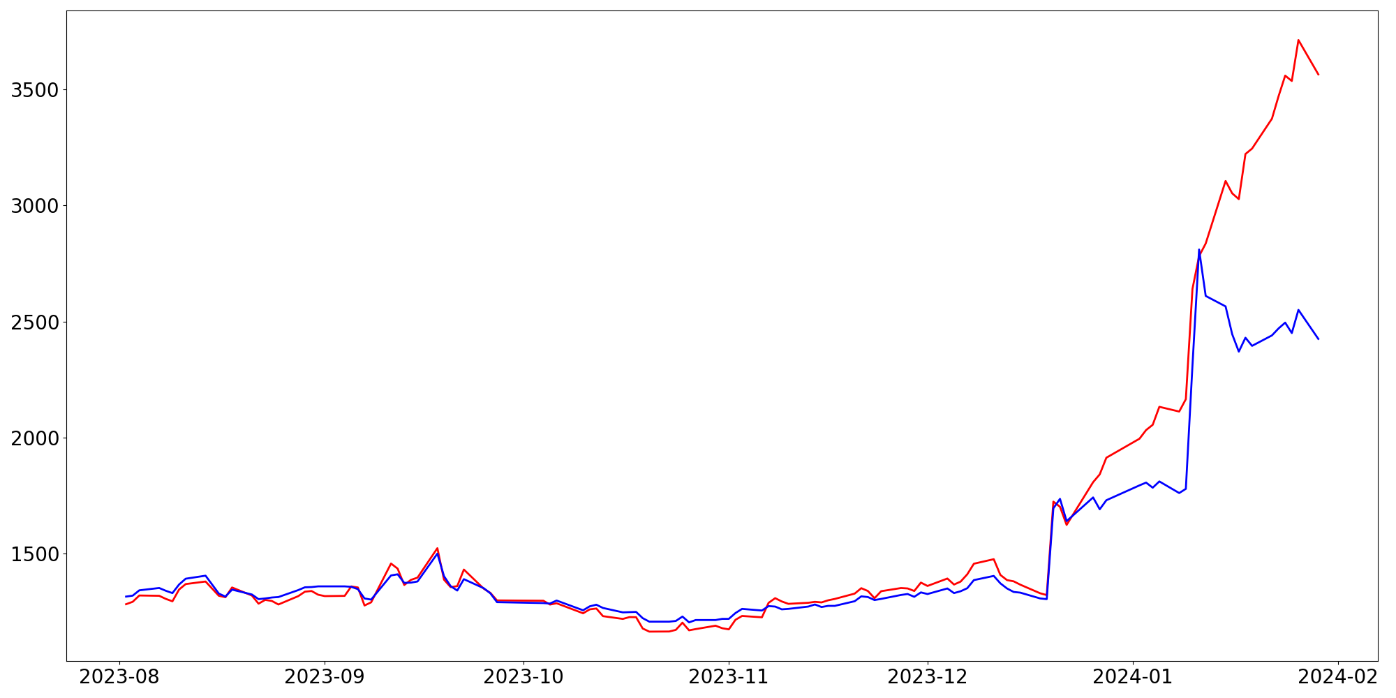 [ - : 실제값(종가) / - : 예측값(종가) ]