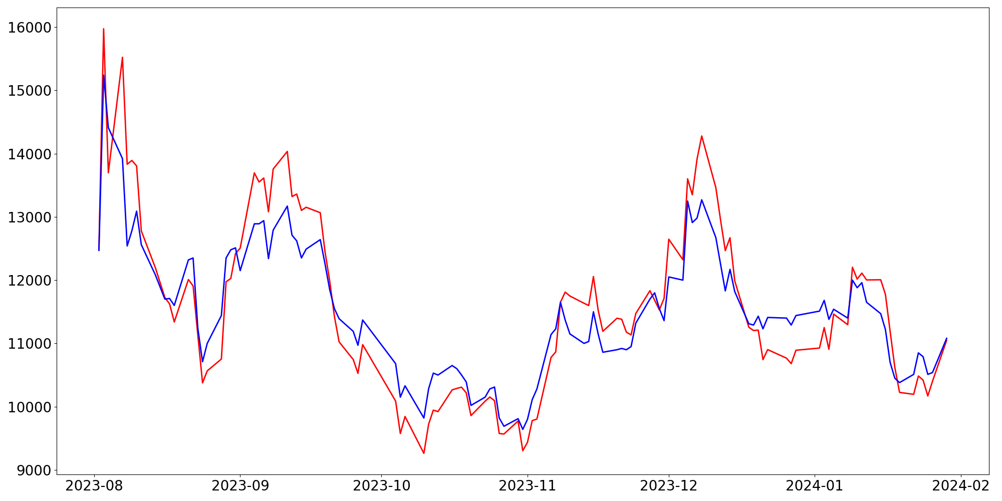 [ - : 실제값(종가) / - : 예측값(종가) ]
