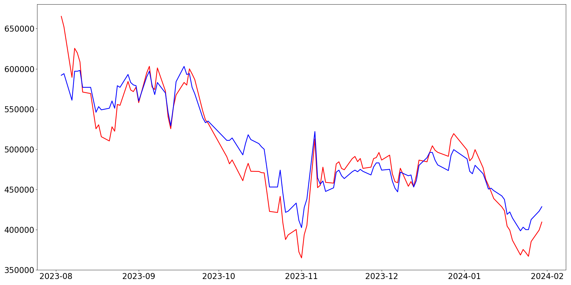 [ - : 실제값(종가) / - : 예측값(종가) ]