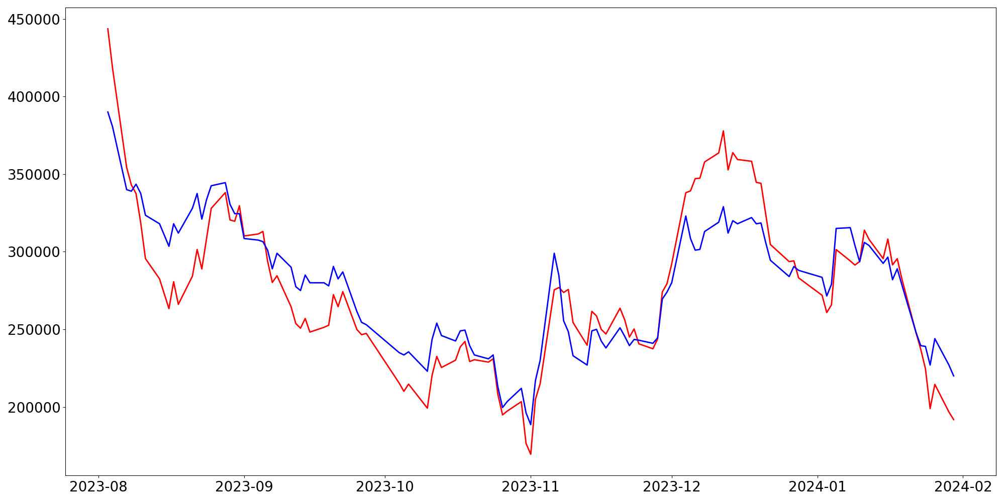[ - : 실제값(종가) / - : 예측값(종가) ]