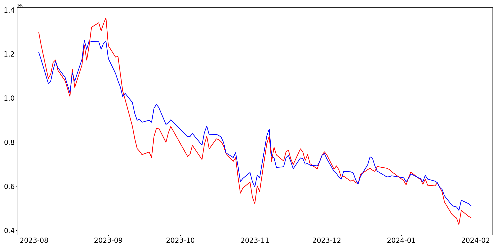 [ - : 실제값(종가) / - : 예측값(종가) ]