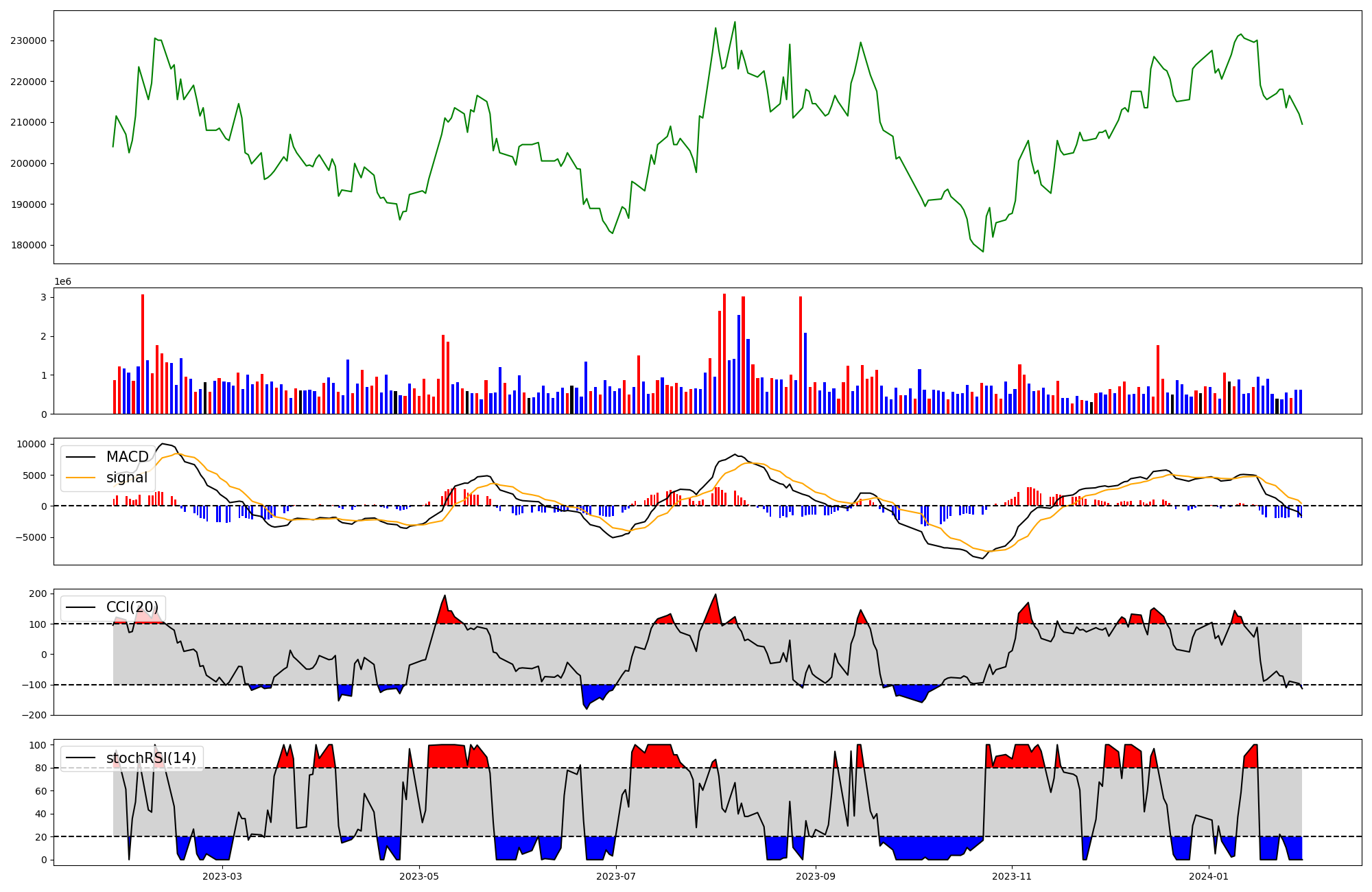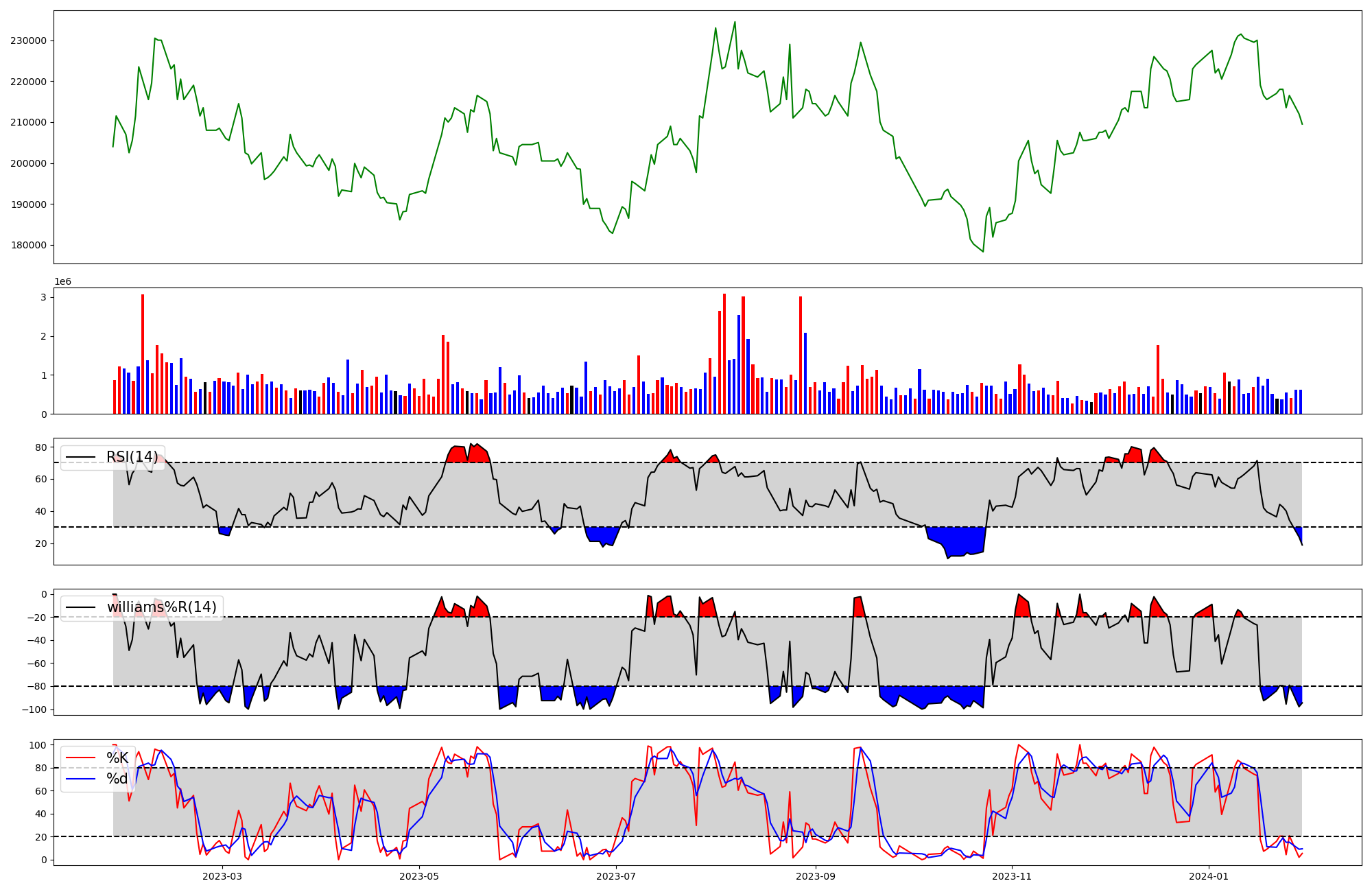 □ 중기 : 현재 종가가 중기(60일) 이동평균값(213,942원)을 하회 하여 중기적 추세 하락 중