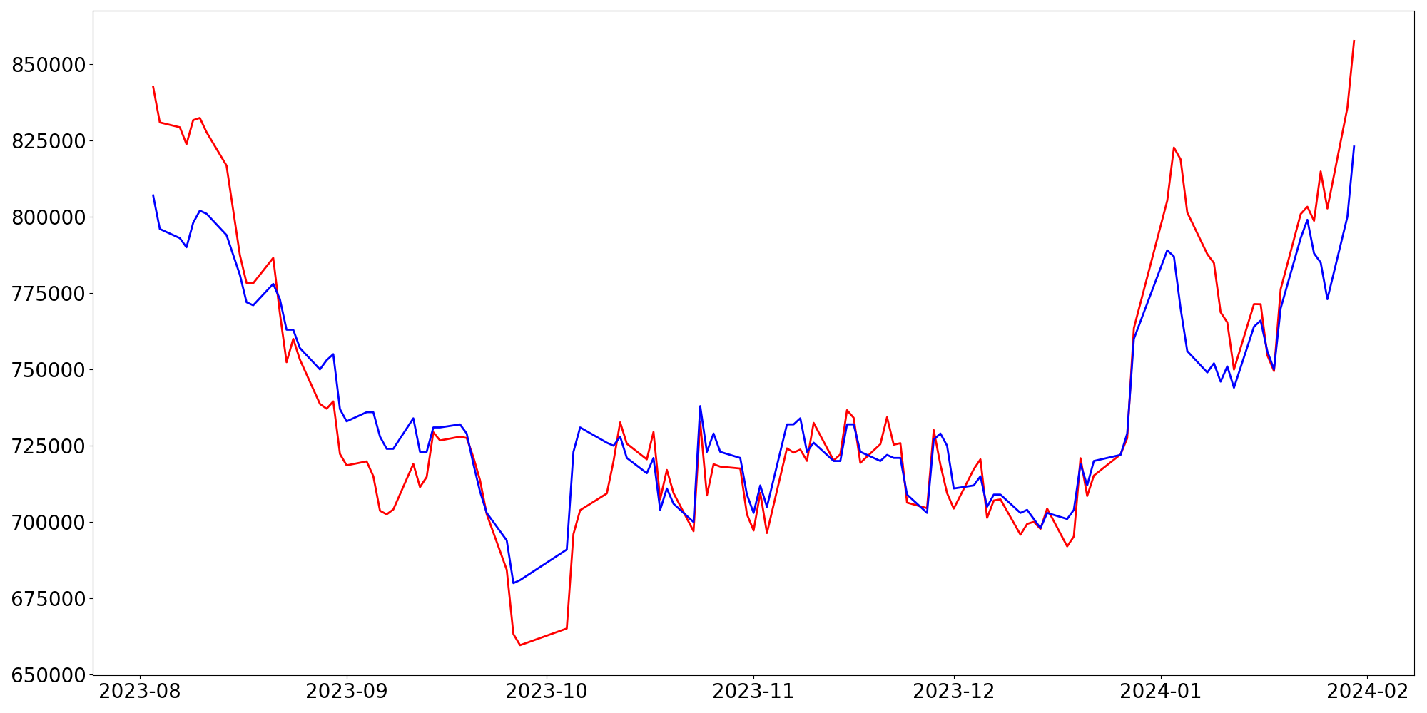 [ - : 실제값(종가) / - : 예측값(종가) ]
