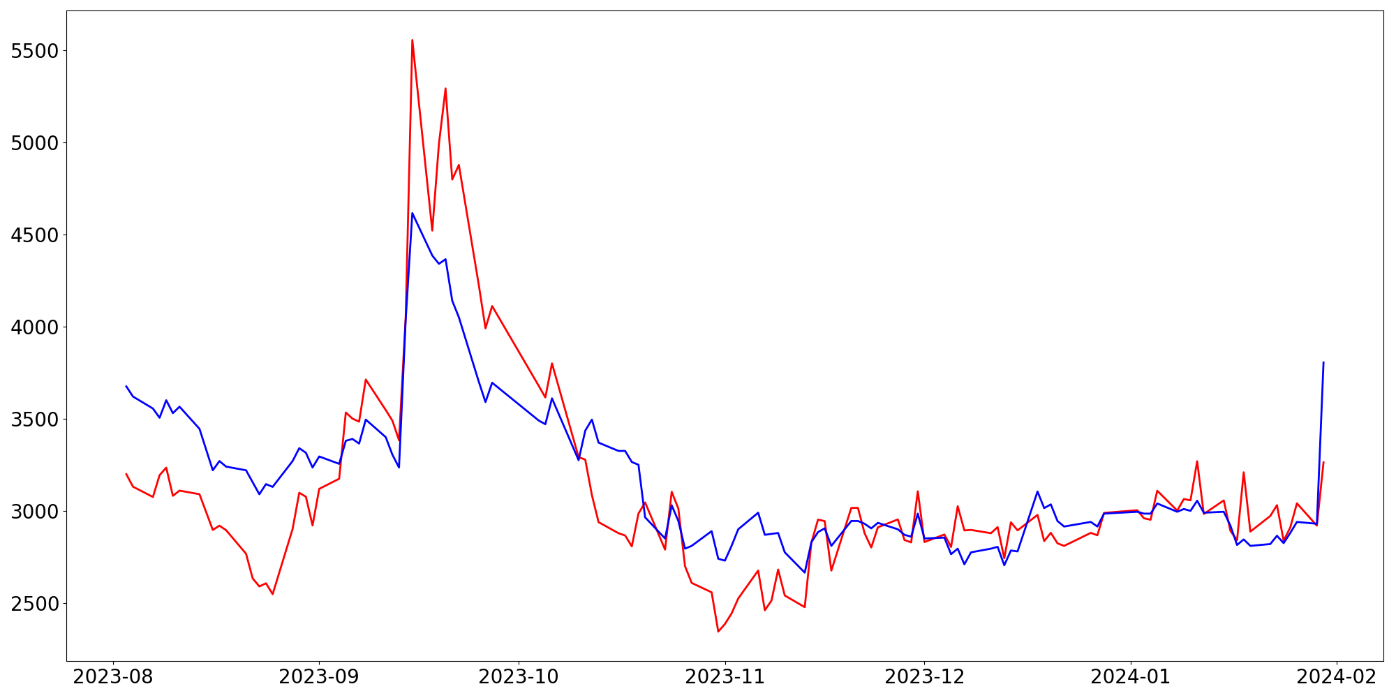 [ - : 실제값(종가) / - : 예측값(종가) ]