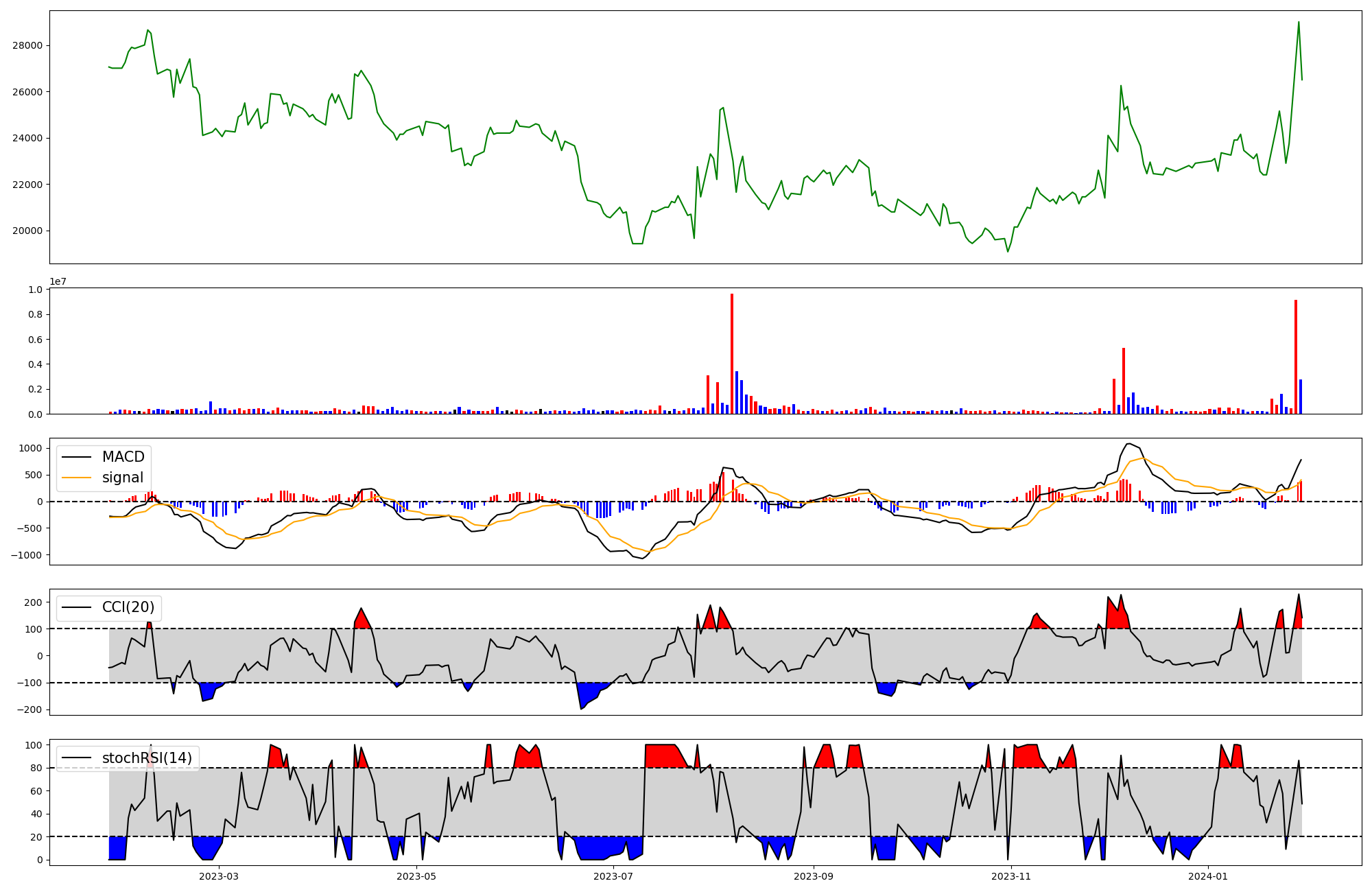 □ 장기 : 현재 종가가 장기(250일) 이동평균값(23,201원)을 상회 하여 장기적 추세 상승 중