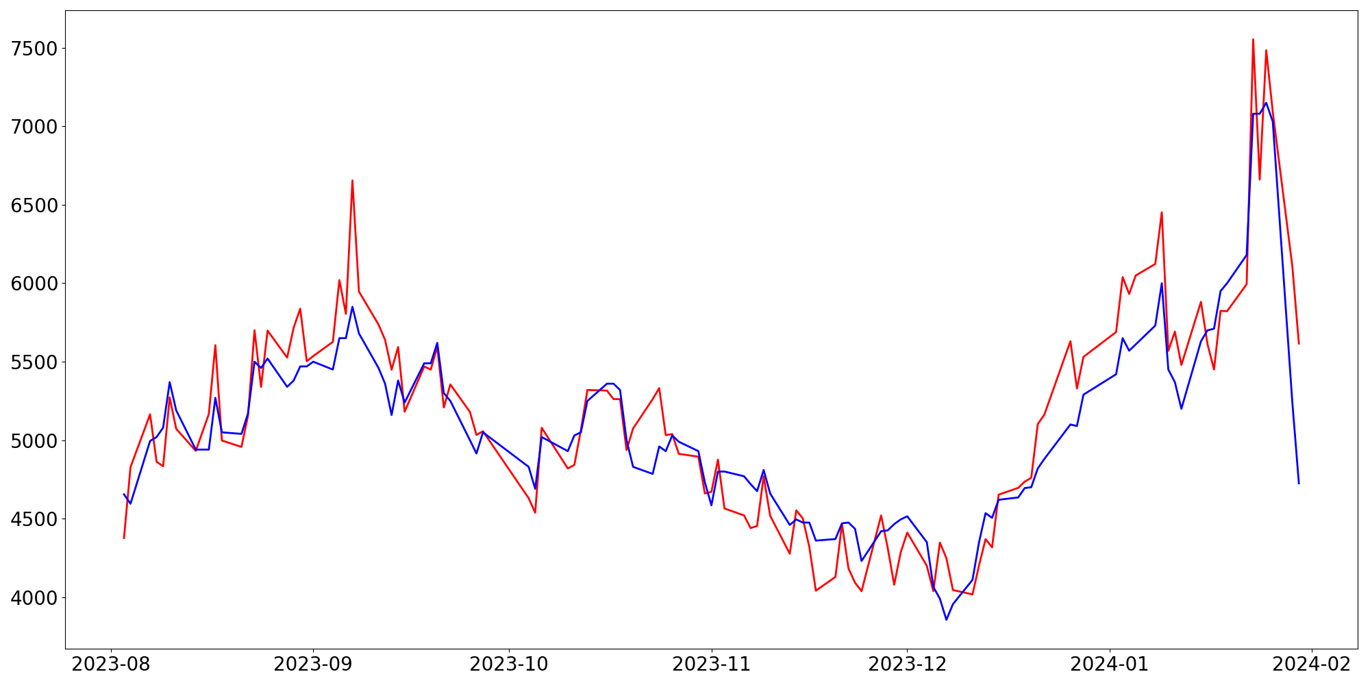 [ - : 실제값(종가) / - : 예측값(종가) ]