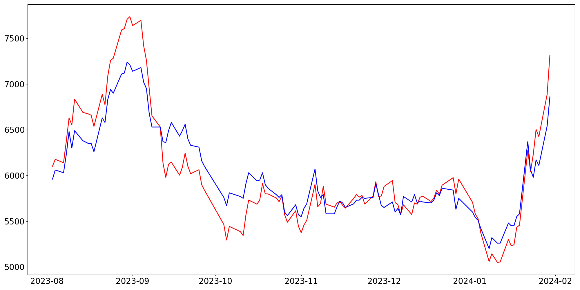 [ - : 실제값(종가) / - : 예측값(종가) ]