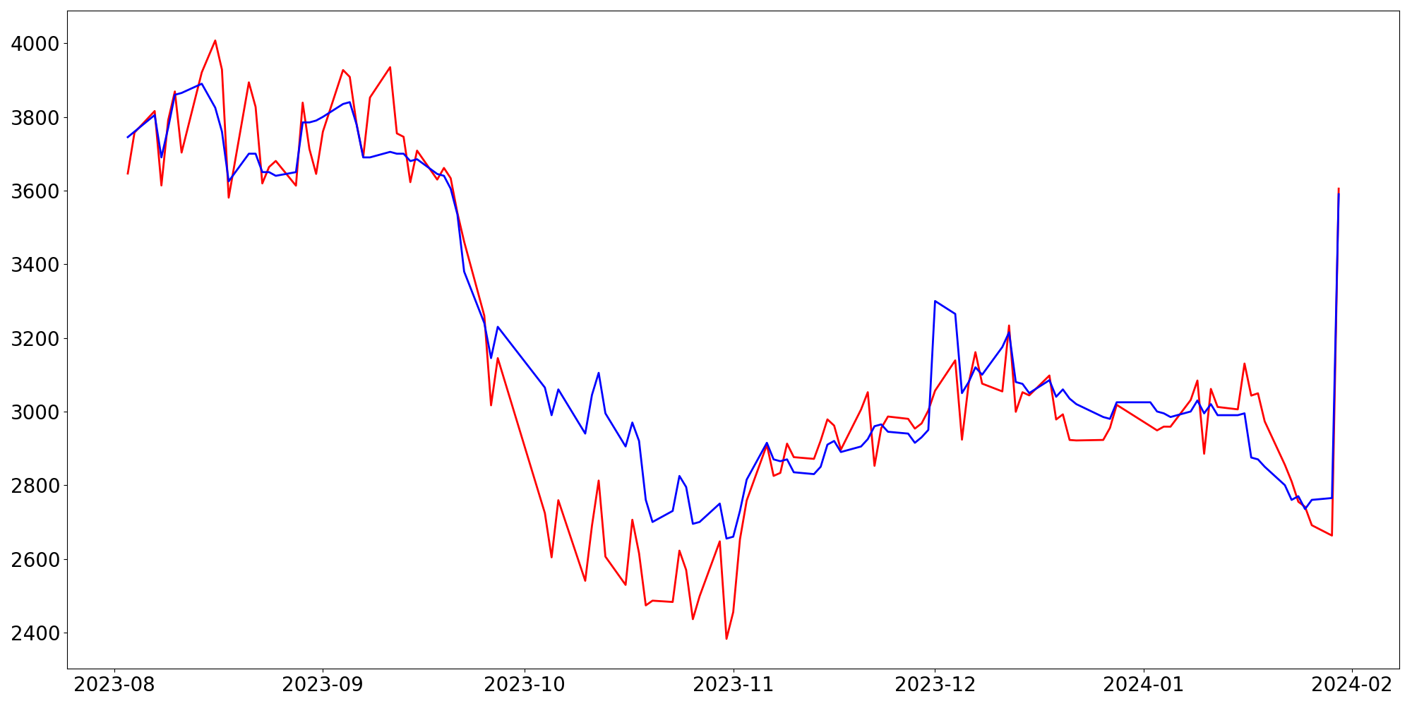 [ - : 실제값(종가) / - : 예측값(종가) ]