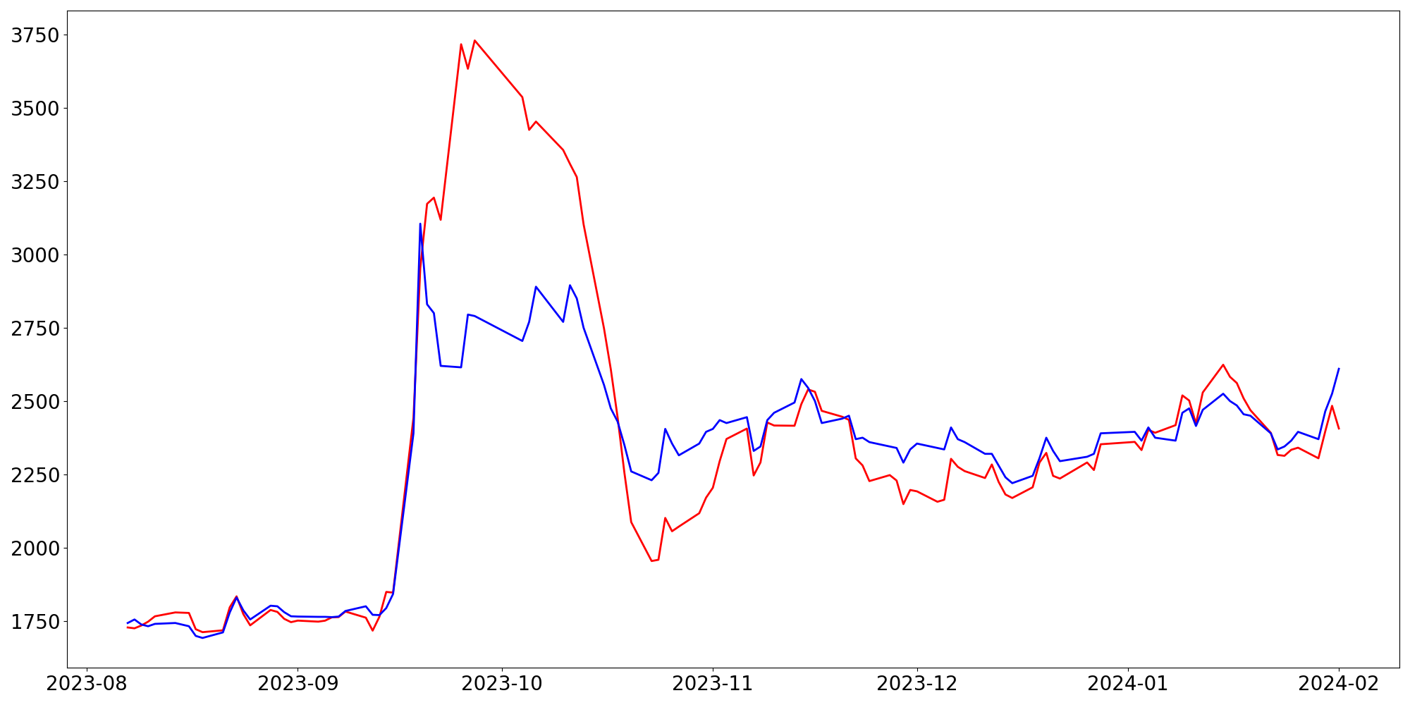 [ - : 실제값(종가) / - : 예측값(종가) ]