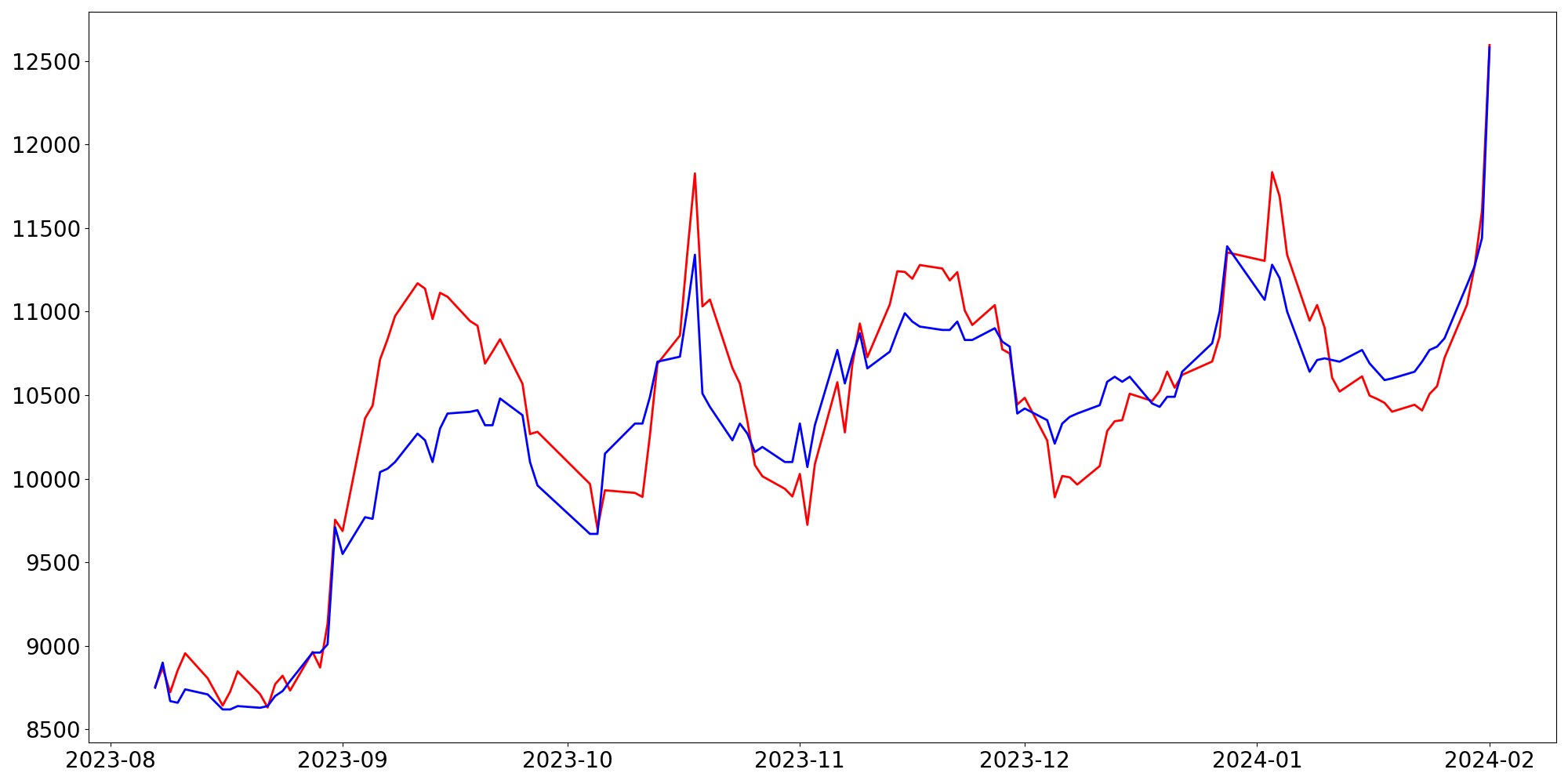 [ - : 실제값(종가) / - : 예측값(종가) ]