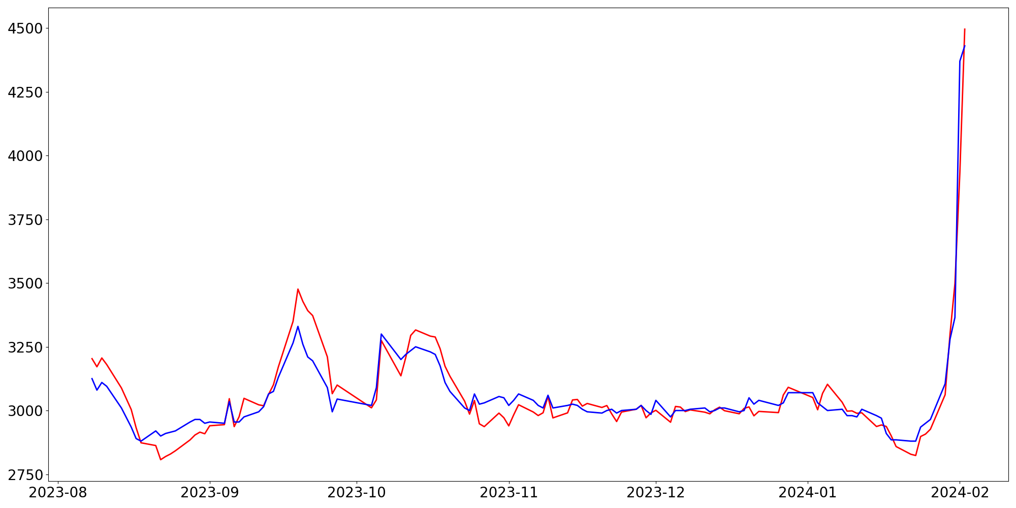 [ - : 실제값(종가) / - : 예측값(종가) ]