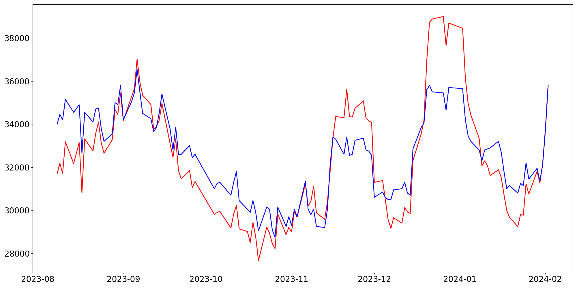 [ - : 실제값(종가) / - : 예측값(종가) ]
