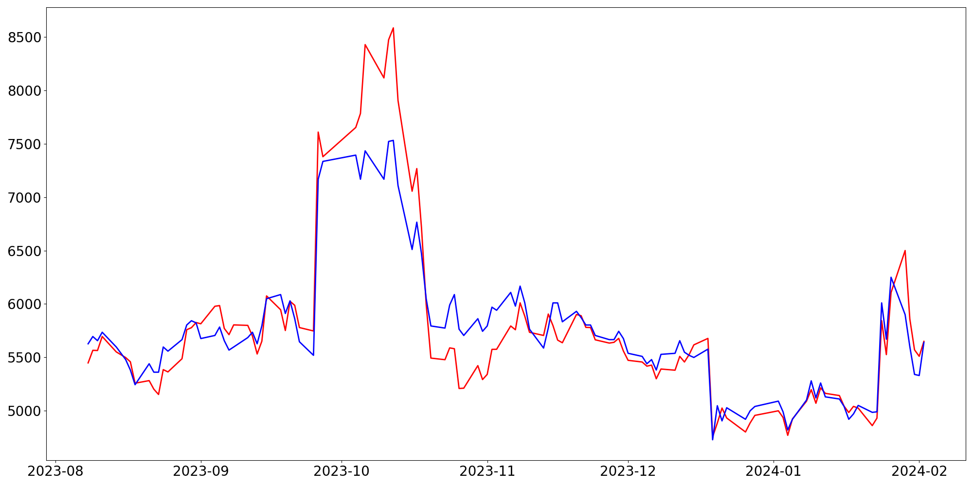 [ - : 실제값(종가) / - : 예측값(종가) ]