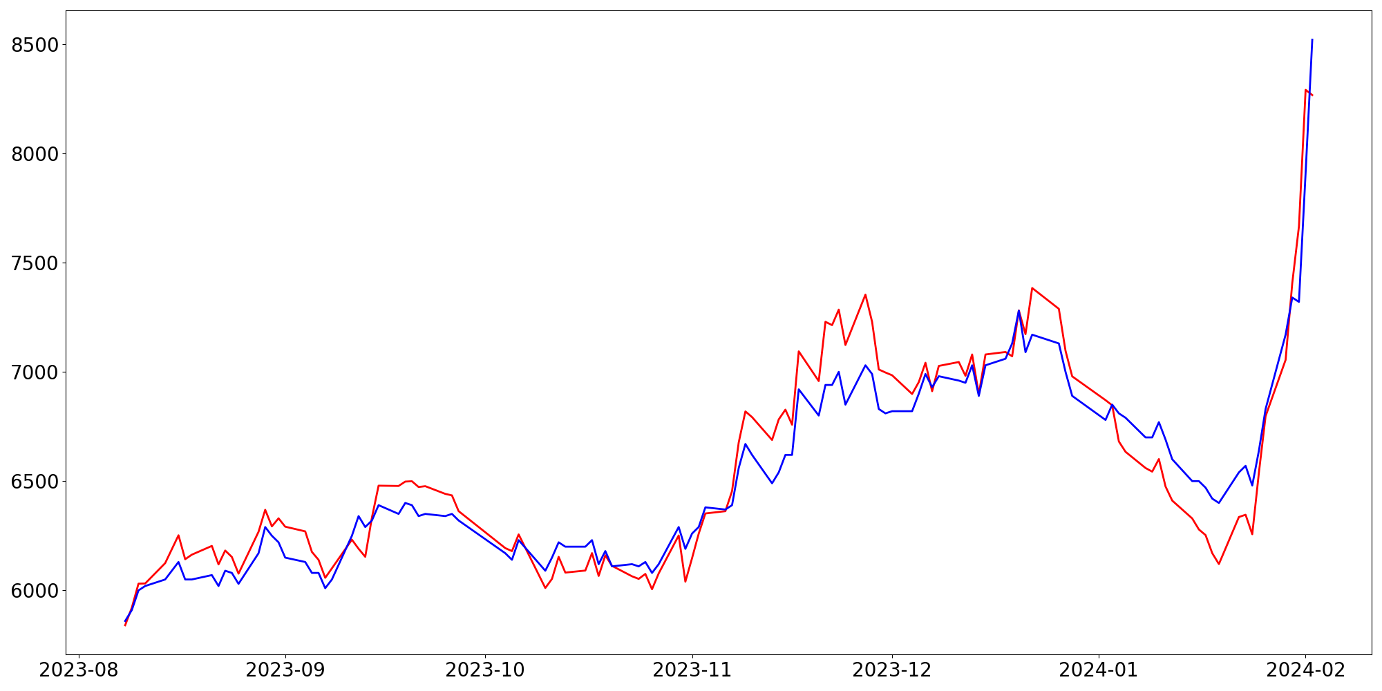 [ - : 실제값(종가) / - : 예측값(종가) ]