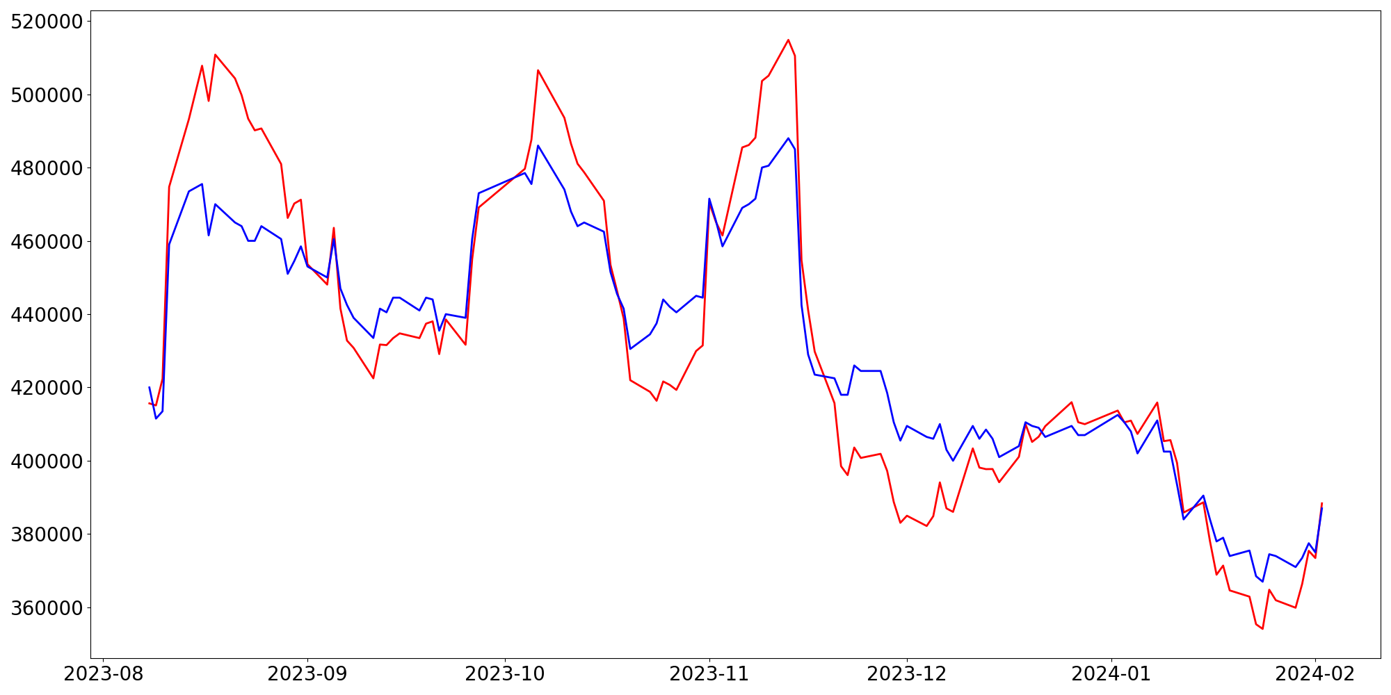 [ - : 실제값(종가) / - : 예측값(종가) ]