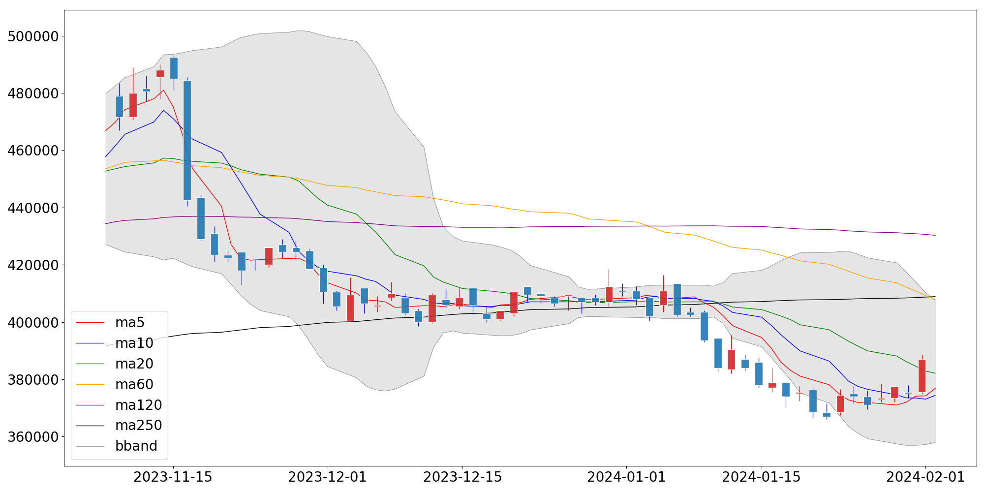 □ 중기 : 현재 종가가 중기(60일) 이동평균값(407,875원)을 하회 하여 중기적 추세 하락 중