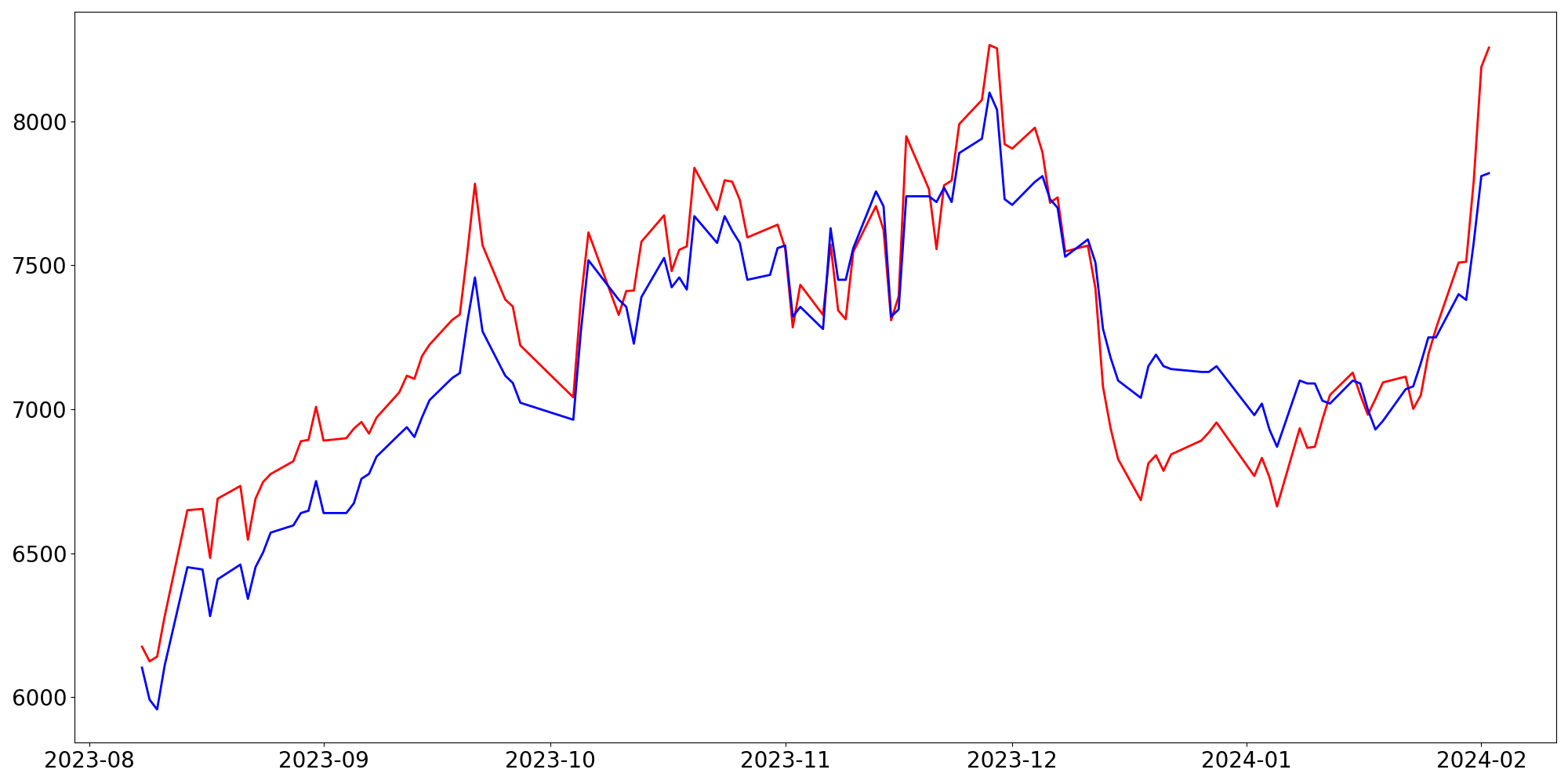 [ - : 실제값(종가) / - : 예측값(종가) ]