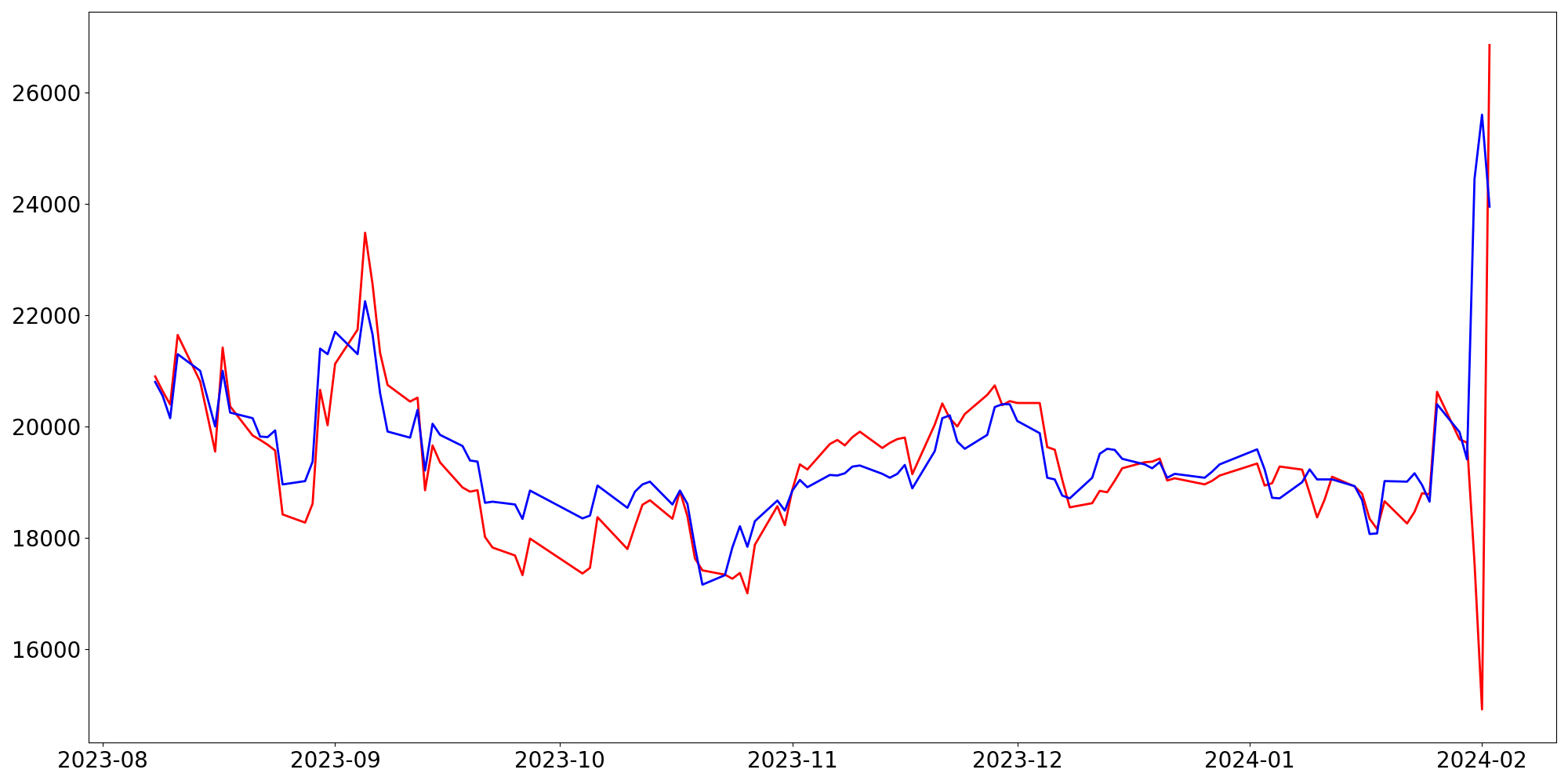 [ - : 실제값(종가) / - : 예측값(종가) ]