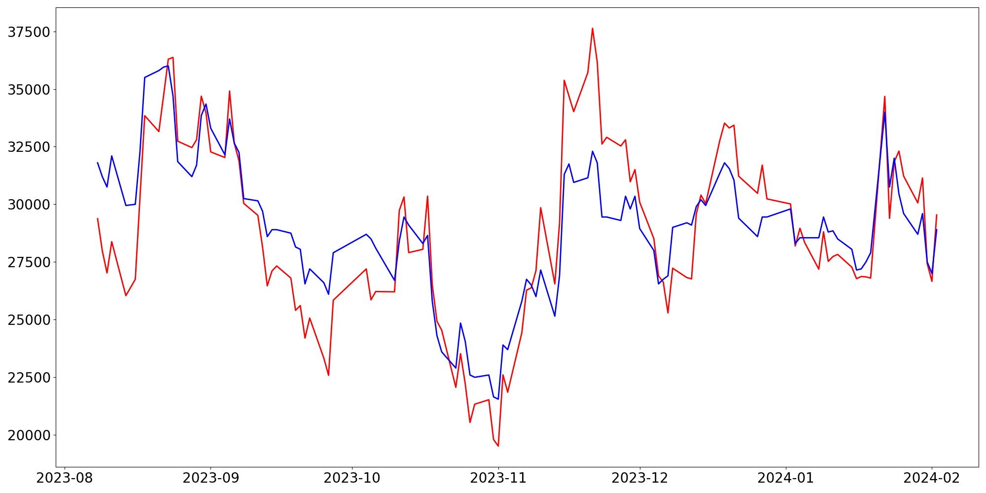 [ - : 실제값(종가) / - : 예측값(종가) ]