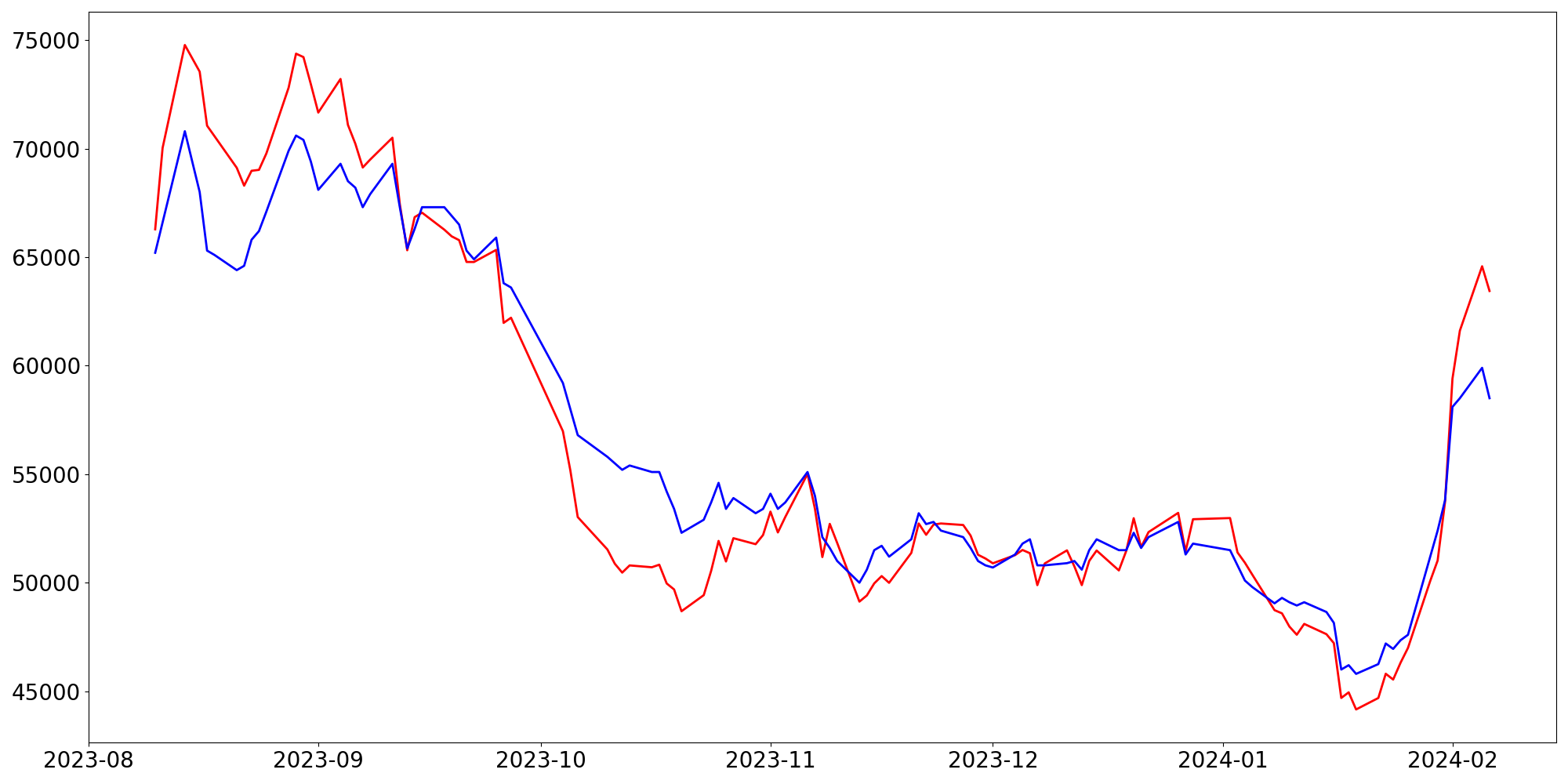 [ - : 실제값(종가) / - : 예측값(종가) ]