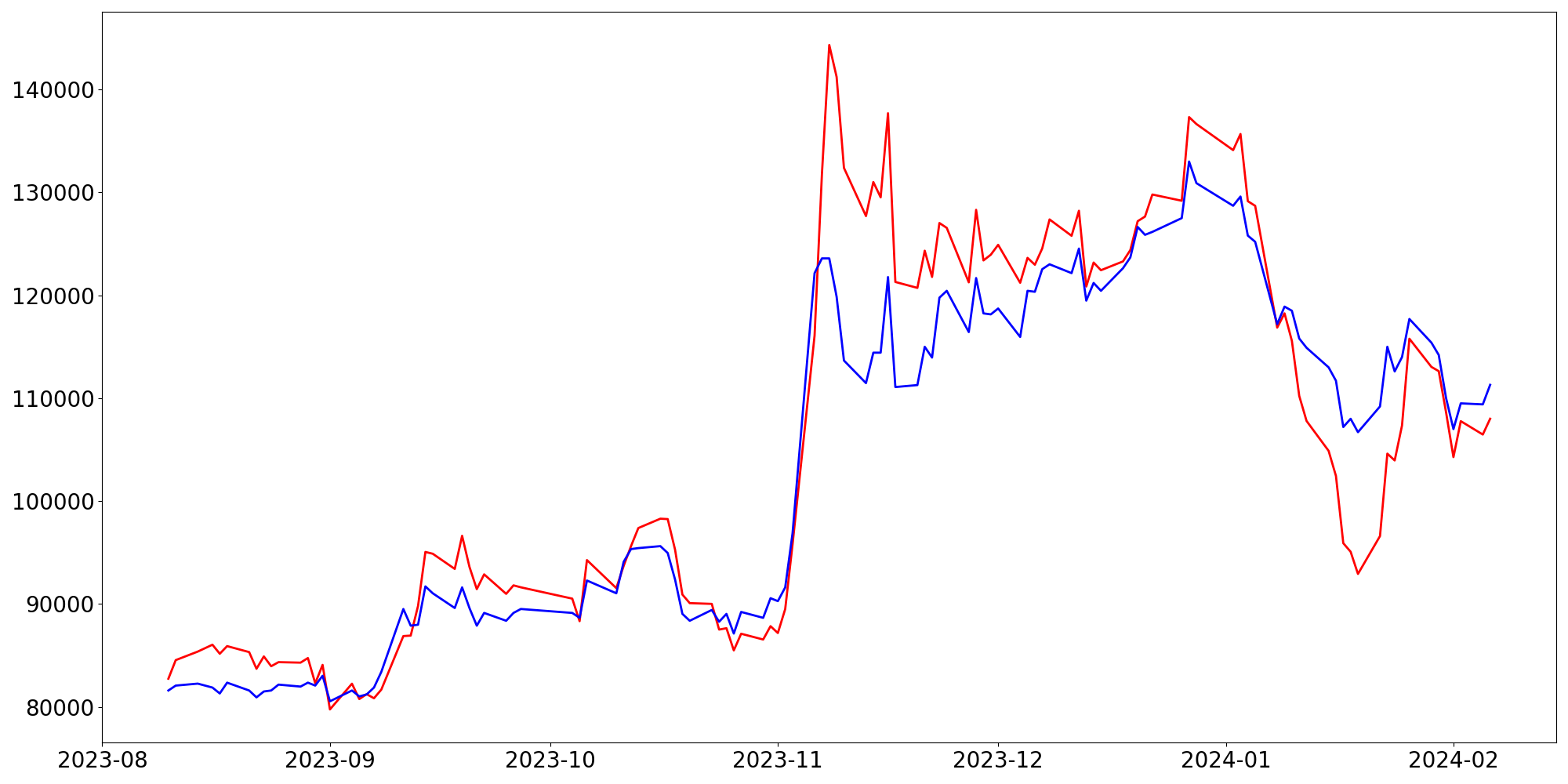 [ - : 실제값(종가) / - : 예측값(종가) ]