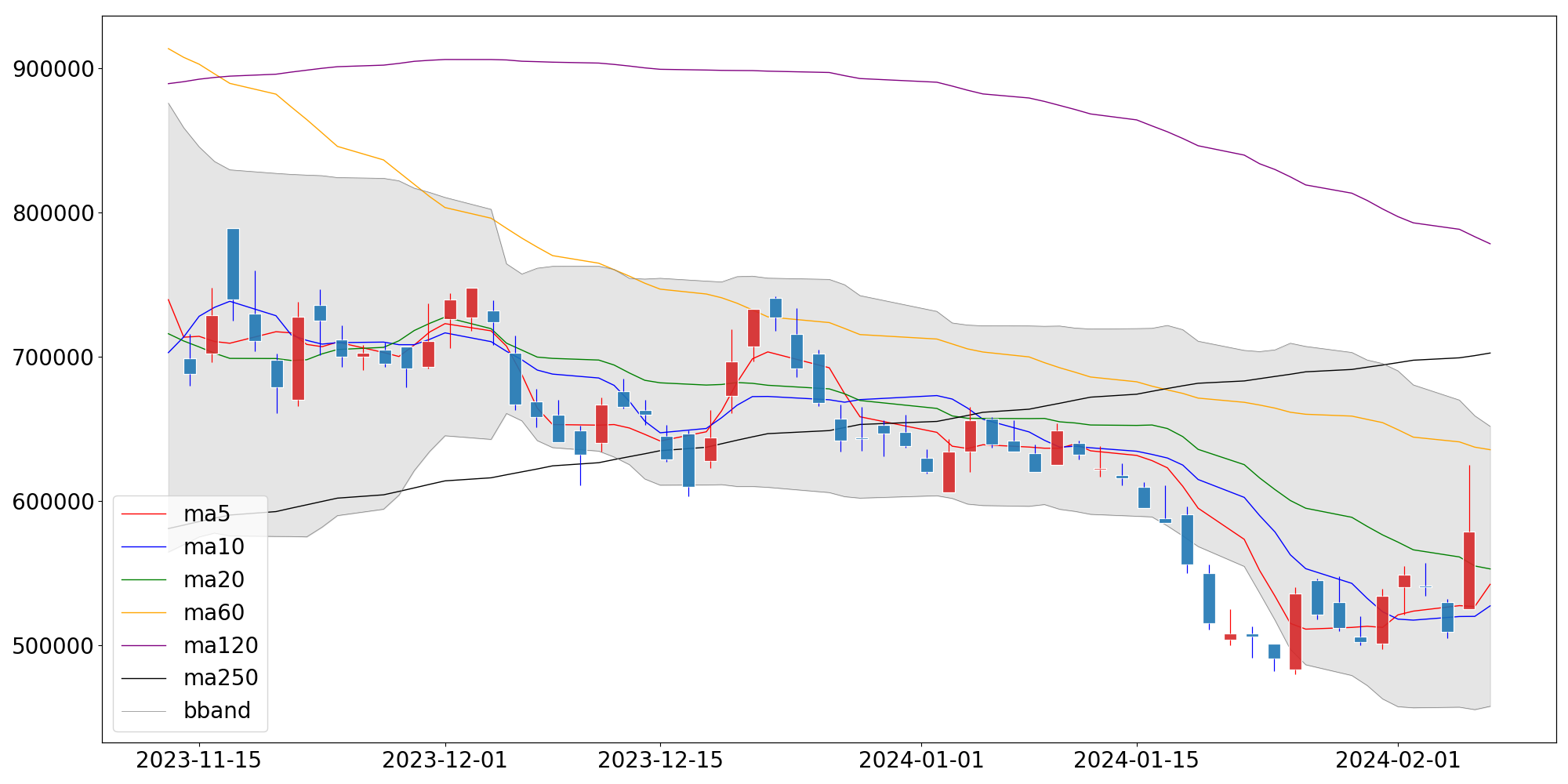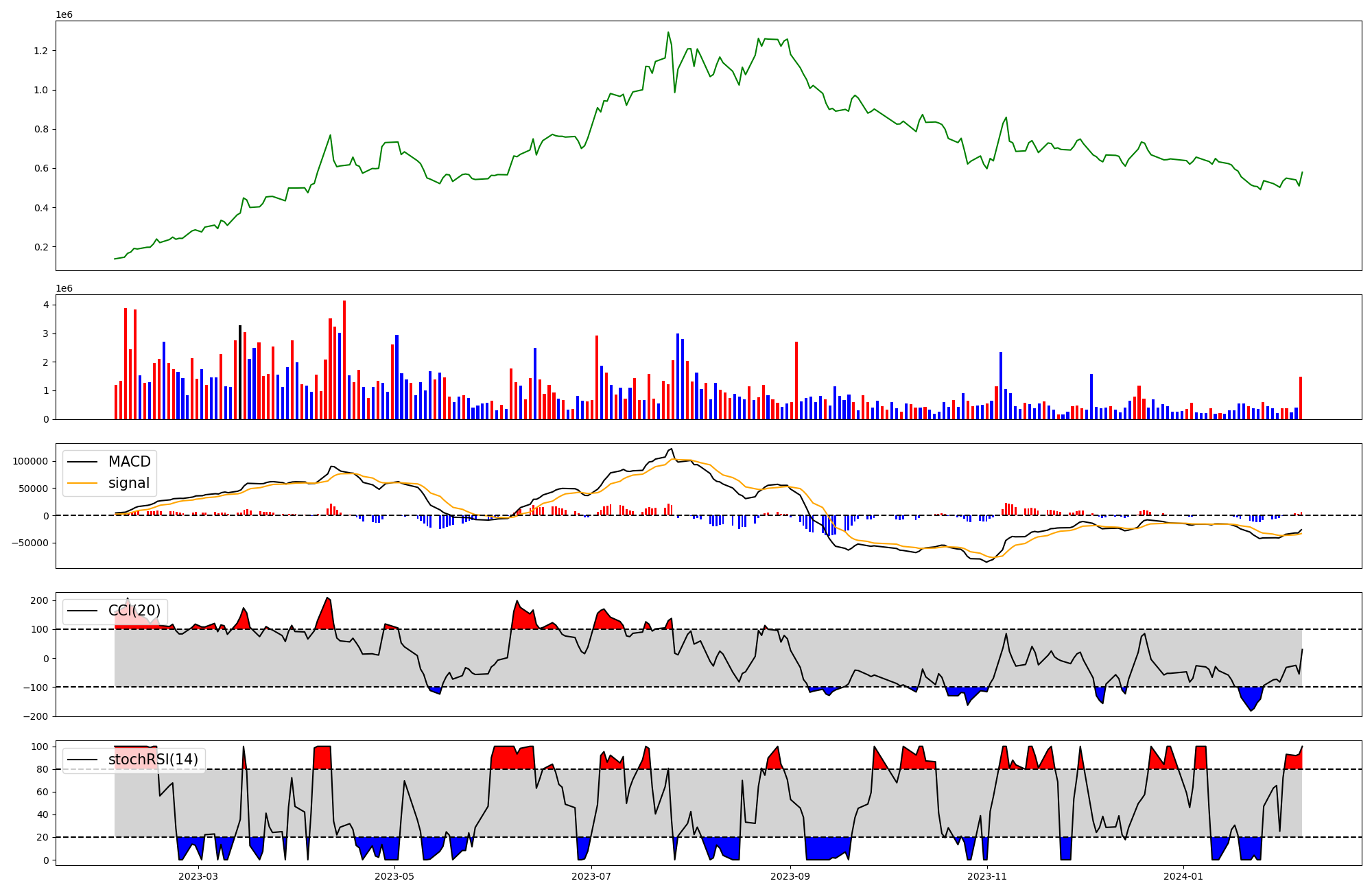 □ 중기 : 현재 종가가 중기(60일) 이동평균값(635,558원)을 하회 하여 중기적 추세 하락 중