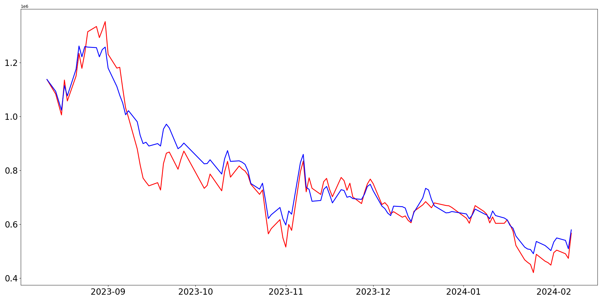 [ - : 실제값(종가) / - : 예측값(종가) ]