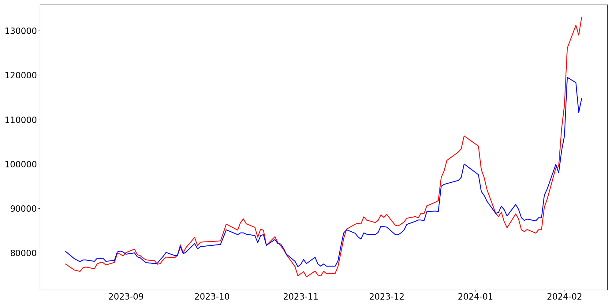 [ - : 실제값(종가) / - : 예측값(종가) ]