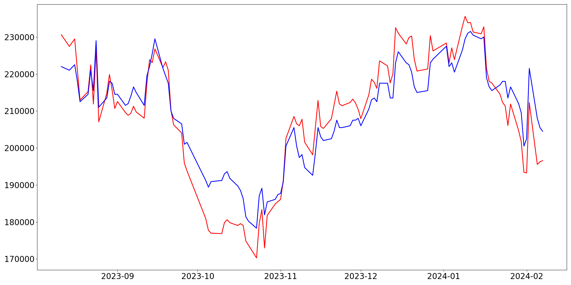[ - : 실제값(종가) / - : 예측값(종가) ]