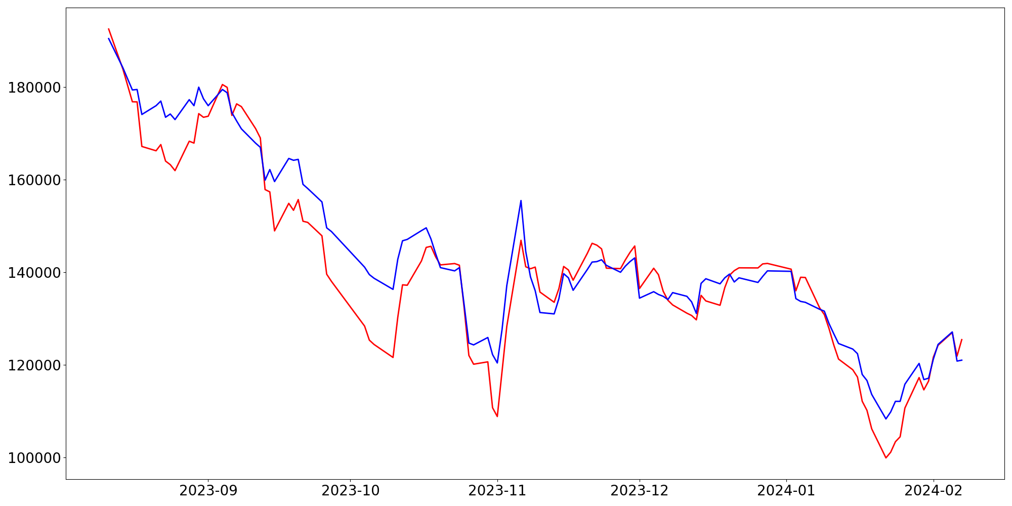 [ - : 실제값(종가) / - : 예측값(종가) ]